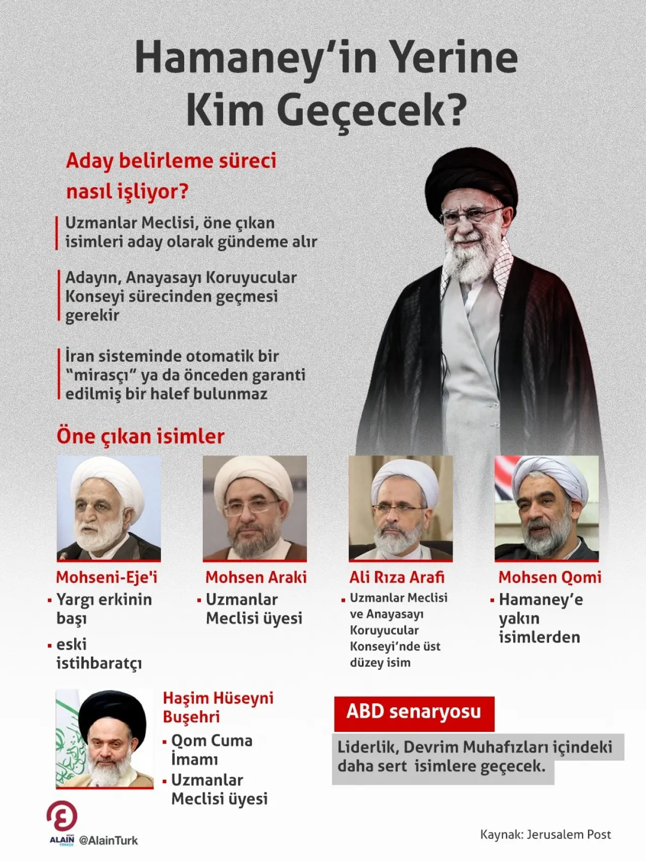 İran’da Dini Lider Ali Hamaney sonrası olası halef tartışmaları gündemdeki yerini korurken, kulislerde öne çıkan isimler ve sürecin nasıl işleyeceği merak konusu oldu.