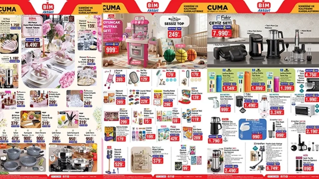 Haftanın son bim aktüel afişi 27 Mart 2026 raflara gelecek diğer ürünler de belli oldu. Yenilenen Bim katalog ürünleri bu hafta çeşitli ürün yelpazesiyle bim broşürü ile yayımlandı. BİM aktüel kataloğunda yine yok yok: uygun fiyatlı teknolojiden mutfak ürünlerine, ev tekstilinden atıştırmalıklara kadar dopdolu bir seçki seni bekliyor. Stoklarla sınırlı bu fırsatları erkenden keşfet, ihtiyaçlarını avantajlı fiyatlarla tamamla! Bim aktüel 27 Mart 2026 kataloğu içerisinde ise; Senna 32' Hd Ready Android 10 Led Tv 6.500 TL, Para Sayma Makinesi 3.750 TL, Xiaomi Redmi 15c Cep Telefonu 13.290 TL, Emsan Çaydanlık 1.190 TL, Güral Porselen 48 Parça Kare Fileli Dekorlu Yemek Takımı 6.490 TL, Paşabahçe Diamond Meşrubat Bardağı 4'lü 139 TL, Paşabahçe Diamond Ayaklı Su Bardağı 6'lı 279 TL, Paşabahçe Timeless 12 Parça Çay Takımı 579 TL, Paşabahçe Kristalin Ayaklı Servis Tabağı 30 cm 299 TL'den satışta olacak. Peki, bu hafta bim'de hangi ürünler var, neler geldi? İşte, Bim aktüel 27 Mart 2026 kataloğu bim afişi tamamı