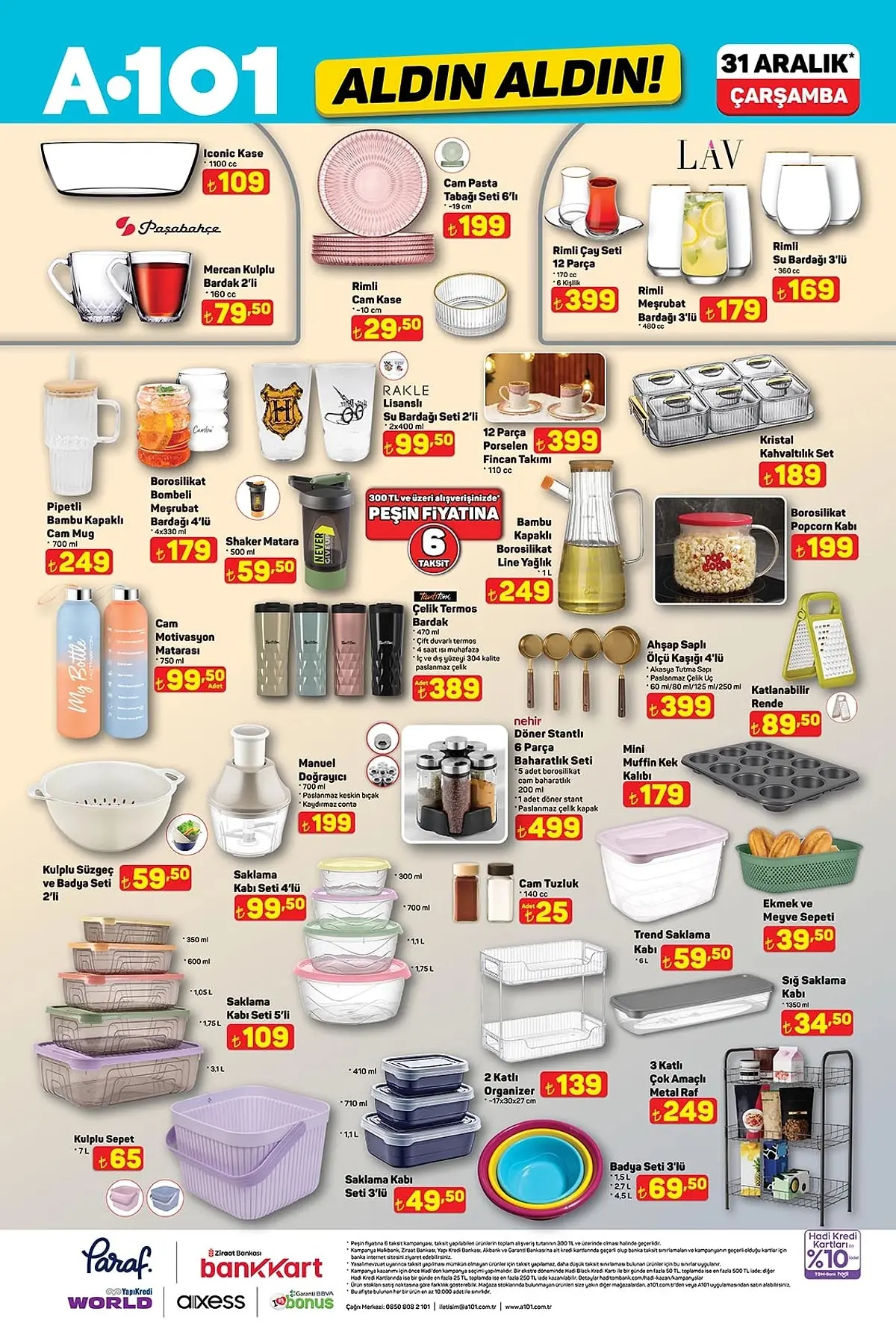 31 Aralık 2025 A101 Aldın Aldın kataloğundaki ürünler, belirtilen tarihten itibaren seçili mağazalarda ve stoklarla sınırlı olarak satışa çıkacak. Yılın son alışverişini avantajlı fiyatlarla yapmak isteyenlerin erken saatlerde mağazaları ziyaret etmesi öneriliyor.