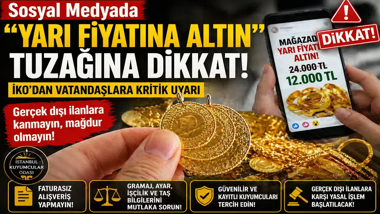 İstanbul Kuyumcular Odası (İKO), son dönemde sosyal medya platformlarında hızla yayılan “yarı fiyatına altın” ilanlarına karşı vatandaşları uyardı. Yapılan açıklamada, bu tür paylaşımların gerçeği yansıtmadığı ve tüketicileri yanıltmaya yönelik olduğu vurgulandı.