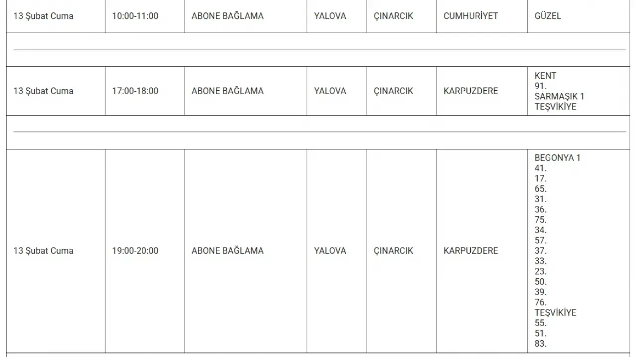 Yalova'da 13 Şubat günü birçok ilçede planlı elektrik kesintisi uygulanacak. Kesintiler, ilçelere göre farklı saat aralıklarında yapılacak.