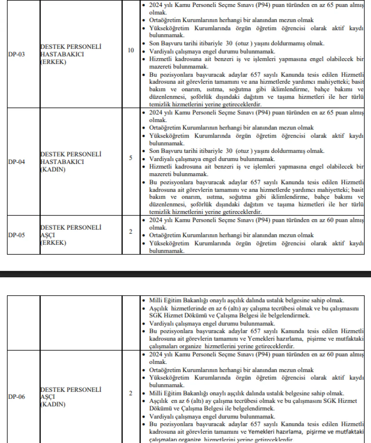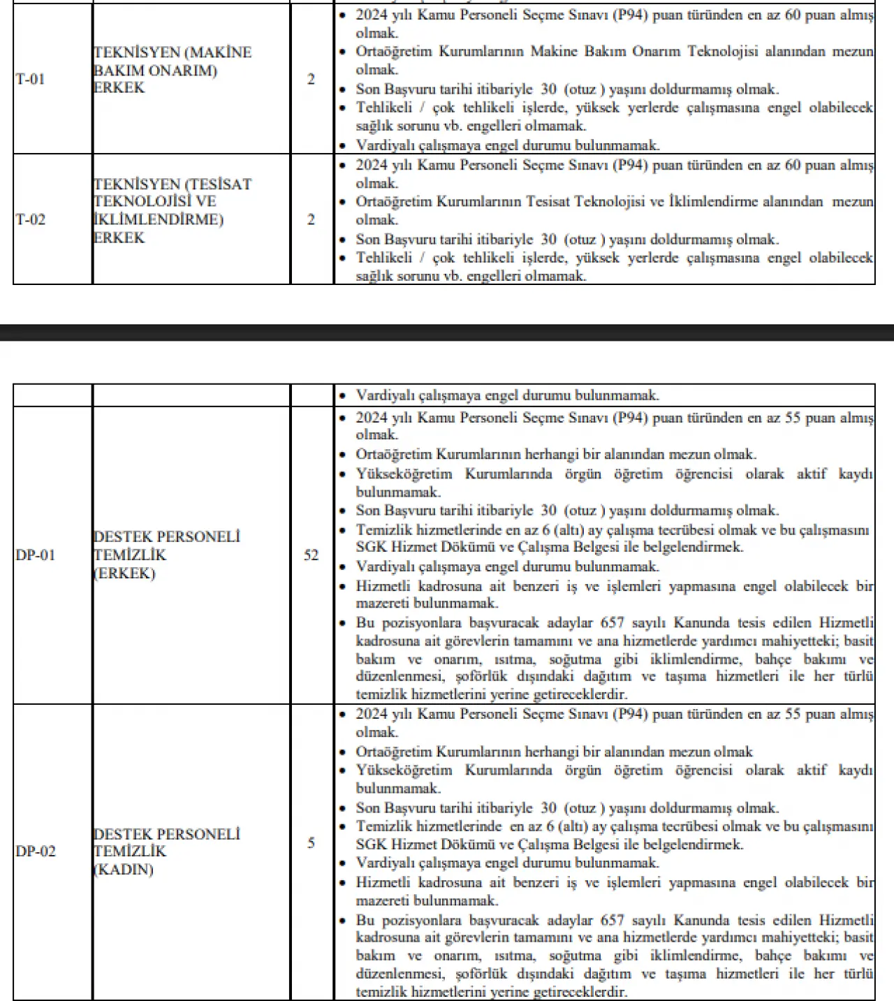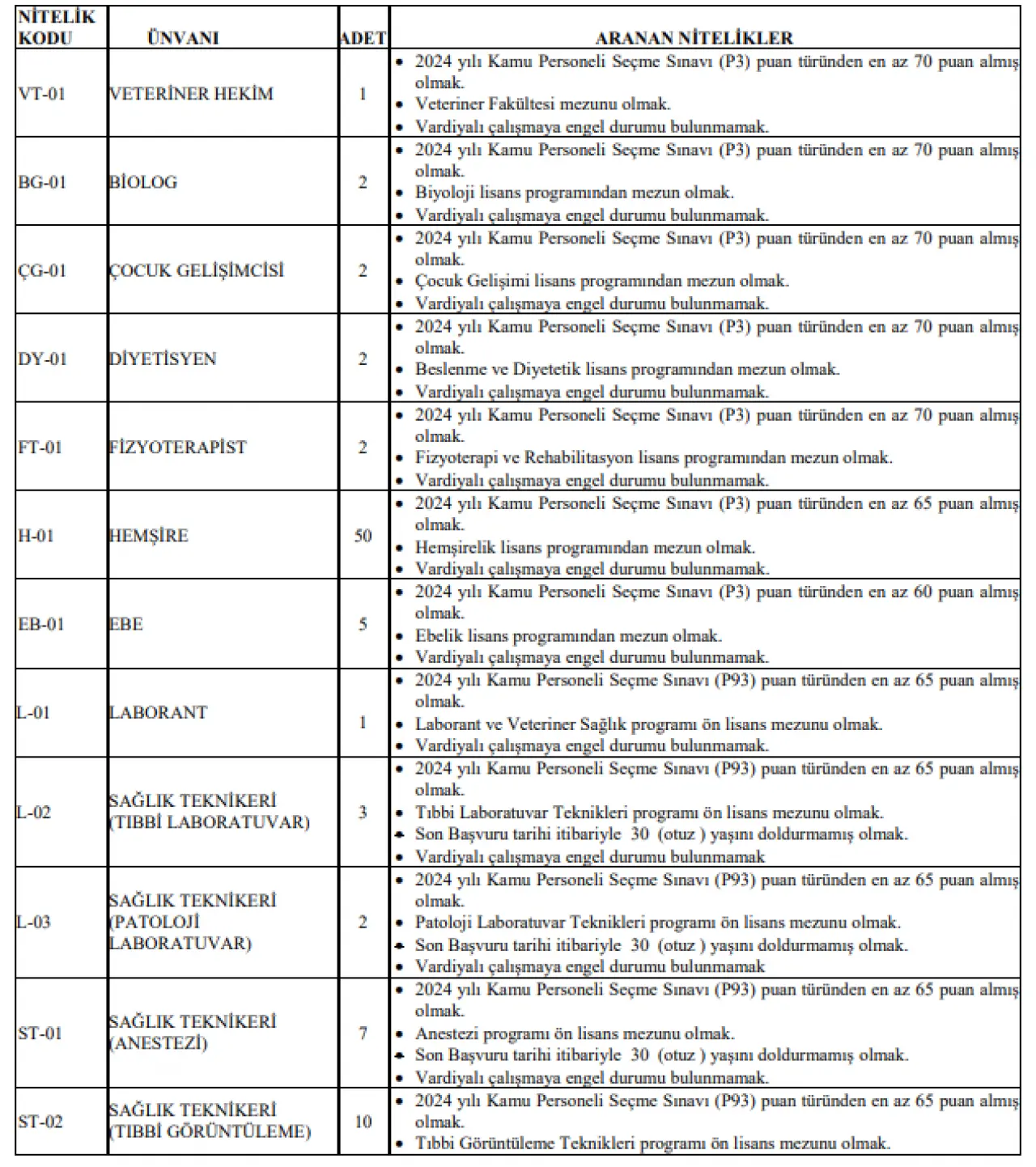 2- 2024 yılı KPSS sınavına girmiş olmak. (Lisans mezunları için KPSS B Grubu P3, Ön lisans mezunları için KPSS P93, Ortaöğretim mezunları için KPSS P94 puanı esas alınacaktır. Adayların 2024 yılı KPSS puanının, başvurduğu nitelik kodunda aranan öğrenim şartına uygun olması gerekmektedir)