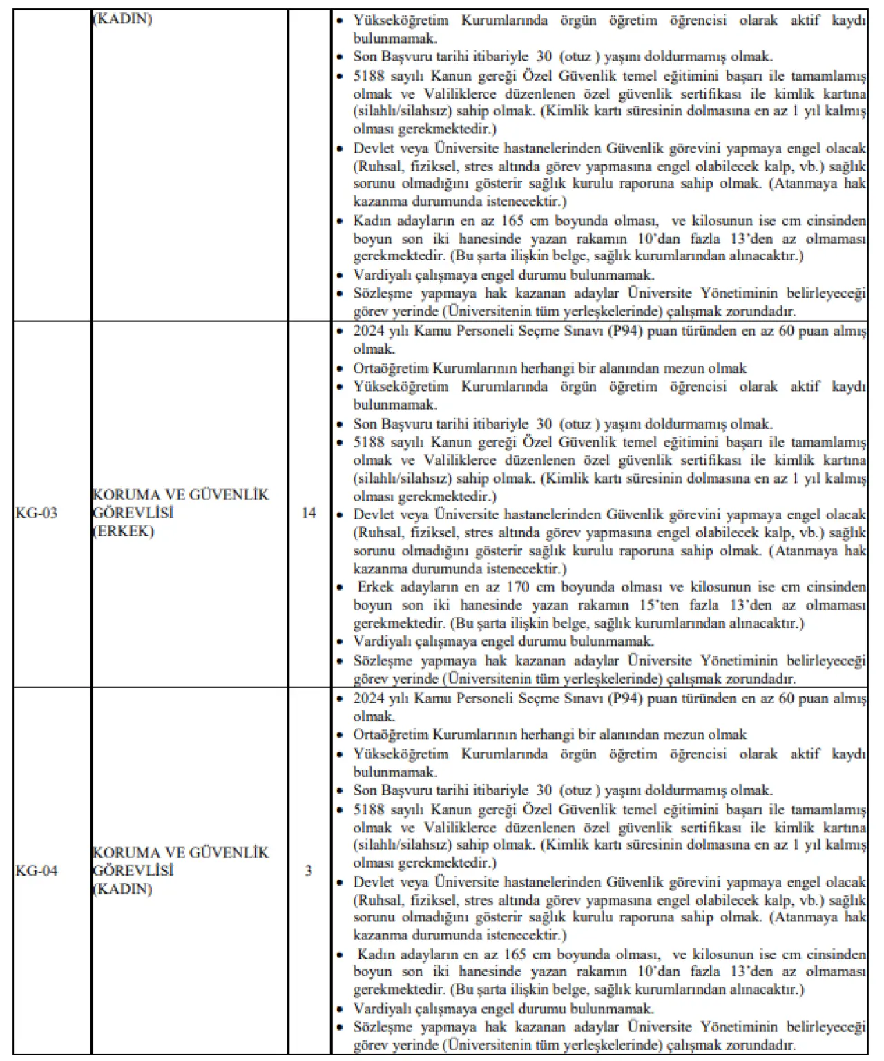 5- KG-01-02 nitelik kodlu pozisyonlara başvuran adaylardan sadece önlisans mezunlarının başvuruları kabul edilecektir. Yükseköğretim Kurumlarında aktif öğrenci olarak kaydının bulunup bulunmadığı üniversitemizce sistem üzerinden kontrol edilecektir. Aktif öğrenci kaydı bulunduğu halde başvuruda bulunan adayların başvuruları kabul edilmeyecektir.