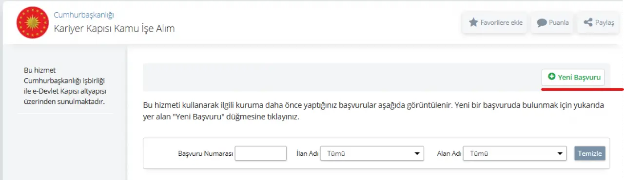 1.ADIM: Başvuru için Kariyer Kapısı https://www.turkiye.gov.tr/cbiko-kamu-ise-alim adresine giriş yapınız. Ekranda gösterildiği gibi "Yeni Başvuru" yazarak ilerliyoruz.