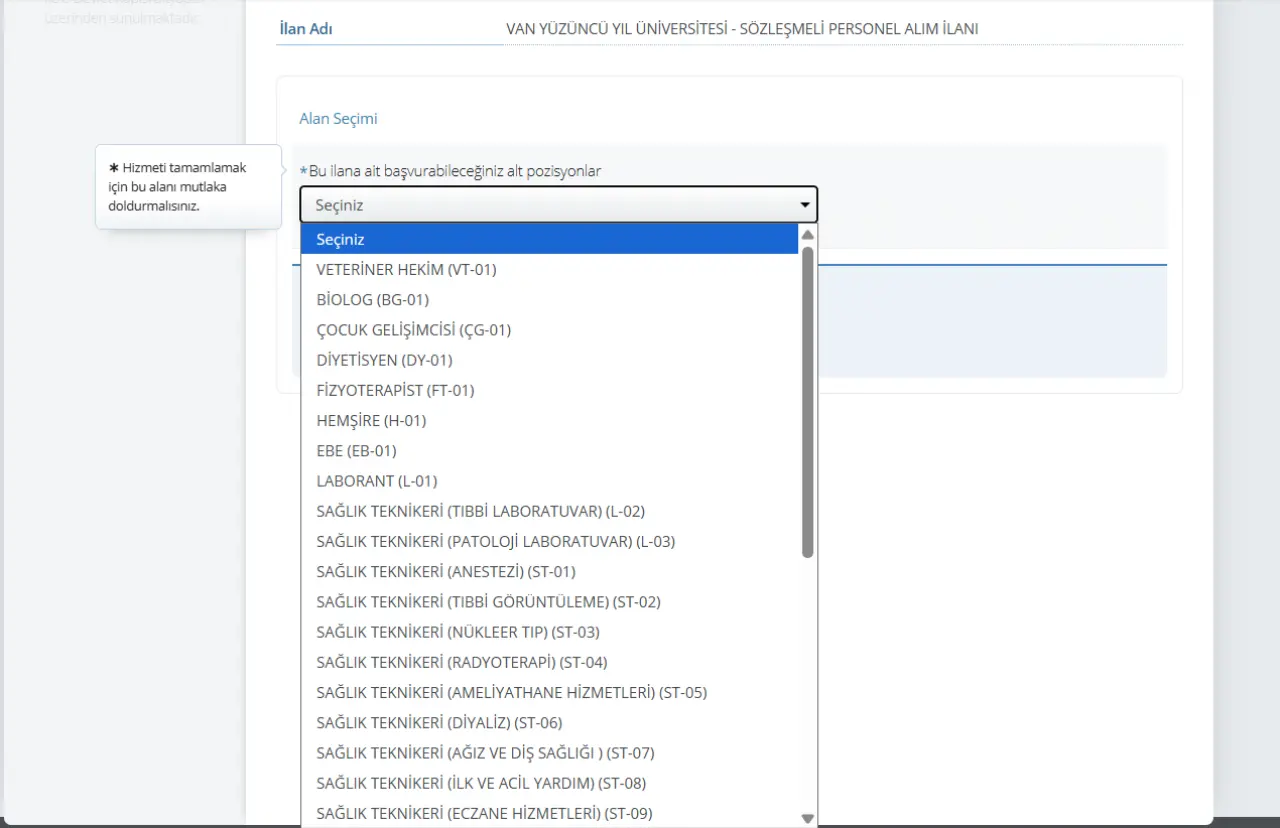 4. ADIM: Açılmış olan bu ekranda ” Bu ilana ait başvurabileceğiniz alt pozisyonlar ” seçeneğindeki başvuru yapacağımız pozisyonları seçiyoruz ve başvurularımıza devam ediyoruz ve başvurumuzu tamamlıyoruz.