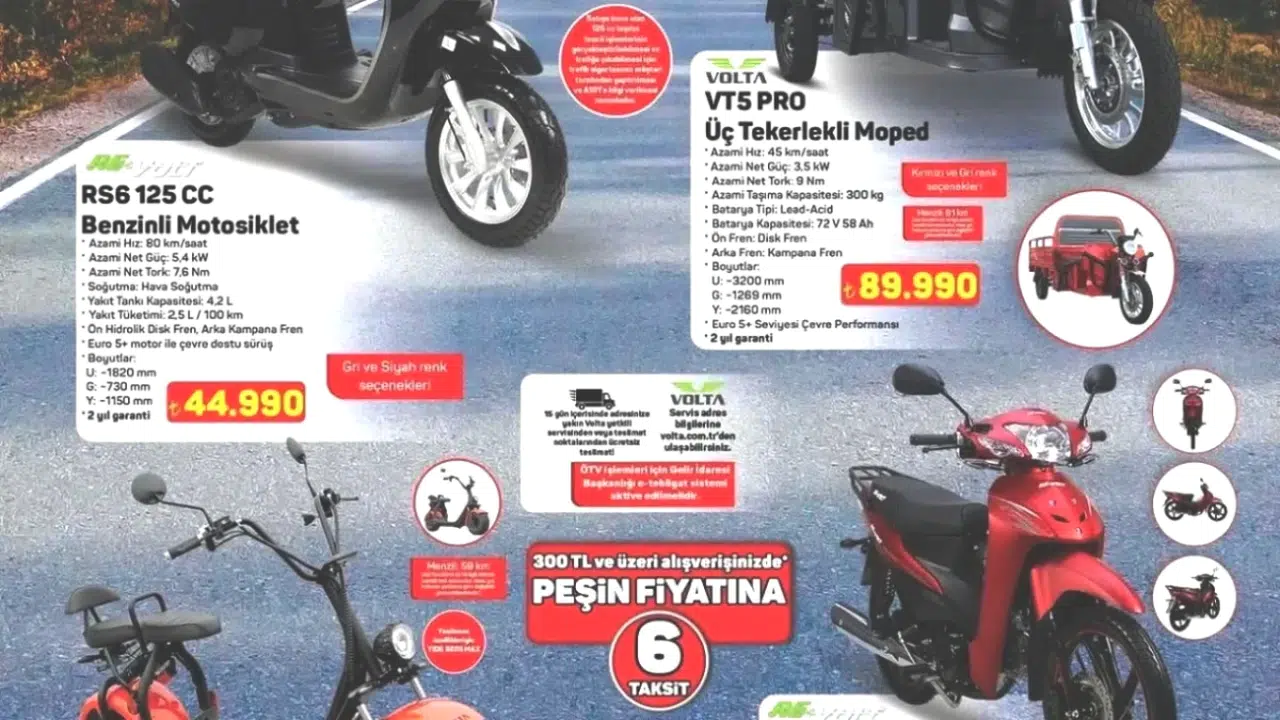 Katalogda dikkat çeken bir diğer ürün ise Volta VTS PRO üç tekerlekli moped modeli. 89.990 TL fiyat etiketi ile kullanıcılara sunulan bu araç, özellikle yük taşımak isteyenler için tasarlanmış. 45 km/saat azami hıza ulaşabilen model, 3,5 kW motor gücüne sahip.