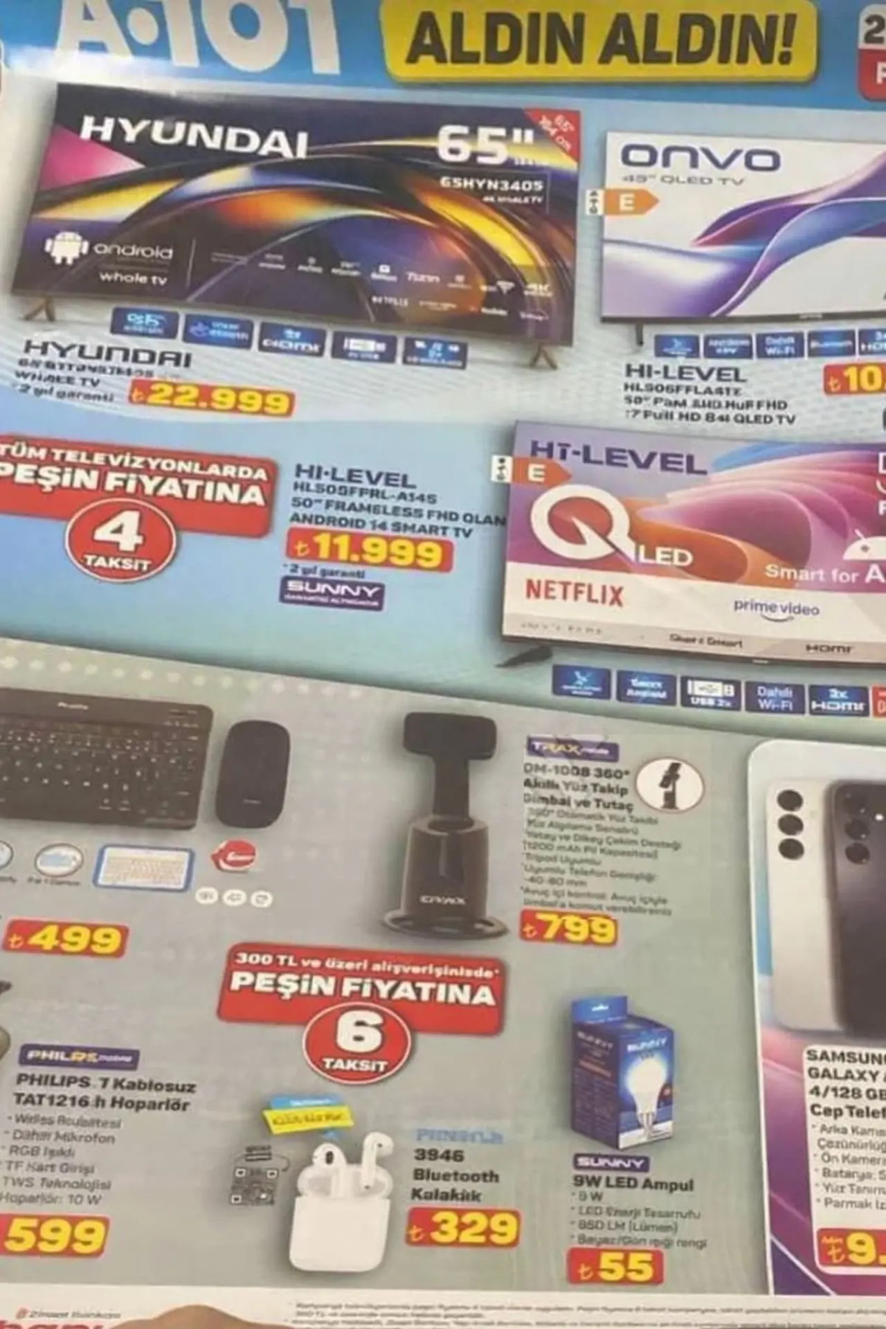 29 Ocak 2026 A101 Kataloğu sayfalarında yer bulan seçili aktüel ürünleri ile muhteşem bir Aldın Aldın kampanyasını kamuoyu ile paylaşan A101 Market 29 Ocak 2026 Kataloğu bu haftada göz dolduruyor. Türkiyenin en büyük market ağına sahip olan A101 Market her kampanya döneminde olduğu gibi bu haftada enflasyonla mücadele kapsamında uygulamış olduğu indirimlerini yeni dönem kampanyası ile devam ettiriyor. A101 Aldın Aldın kampanya etiketi ile 29 Ocak 2026 Perşembe gününden itibaren A101 Market şubelerinde, A101 Onlıne sitesi, A101 Kapıda seçenekleri ile satışa sunulacak A101 29 Ocak 2026 Kataloğu ile haftanın aktüel ürünler ilk sırasında bu haftada Teknoloji grubunda fırsatları dikkatleri çekiyor. Peşin fiyatına 3 taksit imkanı ile; PHILIPS markası ile 2 yıl garantili ücretsiz kurulum avantajlı Dolby Atoms smart özellikli sihirli kumanda, dahili wifi ve 4K Ultra Hd uydu alıcılı Youtube ve Netflix gibi prime video hazır uygulamaları ile Phılıps 65″ 4K UHD Led Dolby Atoms Smart TV 29,999 TL. Phılıps 50″ 4K UHD Led Dolby Atoms Smart TV 17,999 TL. bu aktüel ürünleri A101 kampanya avantajı ile kredi kartına taksit imkanı ile alabilirsiniz. A101 yeni dönem kampanya detayları merakla beklediğiniz 29 Ocak 2026 A101 Aktüel kataloğu içinde ki Teknoloji ürünleri bu kadarla sınırılı değil tabi ki; TOSHIBA markası ile 2 yıl Vestel Servis garantili Vıdaa işletim sisitemli Toshıba 50″ 4K UHD Vıdaa TV 14,999 TL. ONVO markası ile 2 yıl garantili Google işletim sistemi, Qled teknolojisi ile göz dolduran dahili uydu alıcılı dahili uydu alıcılı, kablosuz görüntü aktarma ve smart özellikleri ile Onvo 55″ Frameless UHD Qled Goole TV 16,999 TL. bu ürünleri peşin fiyatına 3 taksit imkanı ile alabileceksiniz. A101’de bu hafta kampanya listesinde Beyaz Eşya grubunda 29 Ocak 2026 A101 Aktüel Katalog içeriğinde yer almış fırsat ürünleri ise; SEG markası ile 2 yıl garantili olan 10 iş gününde Ücretsiz teslimat ve kurulum peşin fiyatına kredi kartına 3 taksit imkanı ile Led göstergeli, çocuk kilidi, 6 program, hızlı yıkama, 12 kişilik yıkama kapasiteli SEG Bulaşık Makinesi 10,499 TL. Çift kapılı 451 litre iç hacime sahip olan SEG No-Frost Buzdolabı 19,999 TL. REGAL markası ile 2 yıl garantili Büro Tipi Buzdolabı 6,999 TL. indirimli fiyatları A101 Kataloğu kampanya avantajları ile bu ürünleride kredi kartına peşin fiyatına 3 taksit ile 5 Şubat 2026 Perşembe gününe kadar alabilirsiniz.