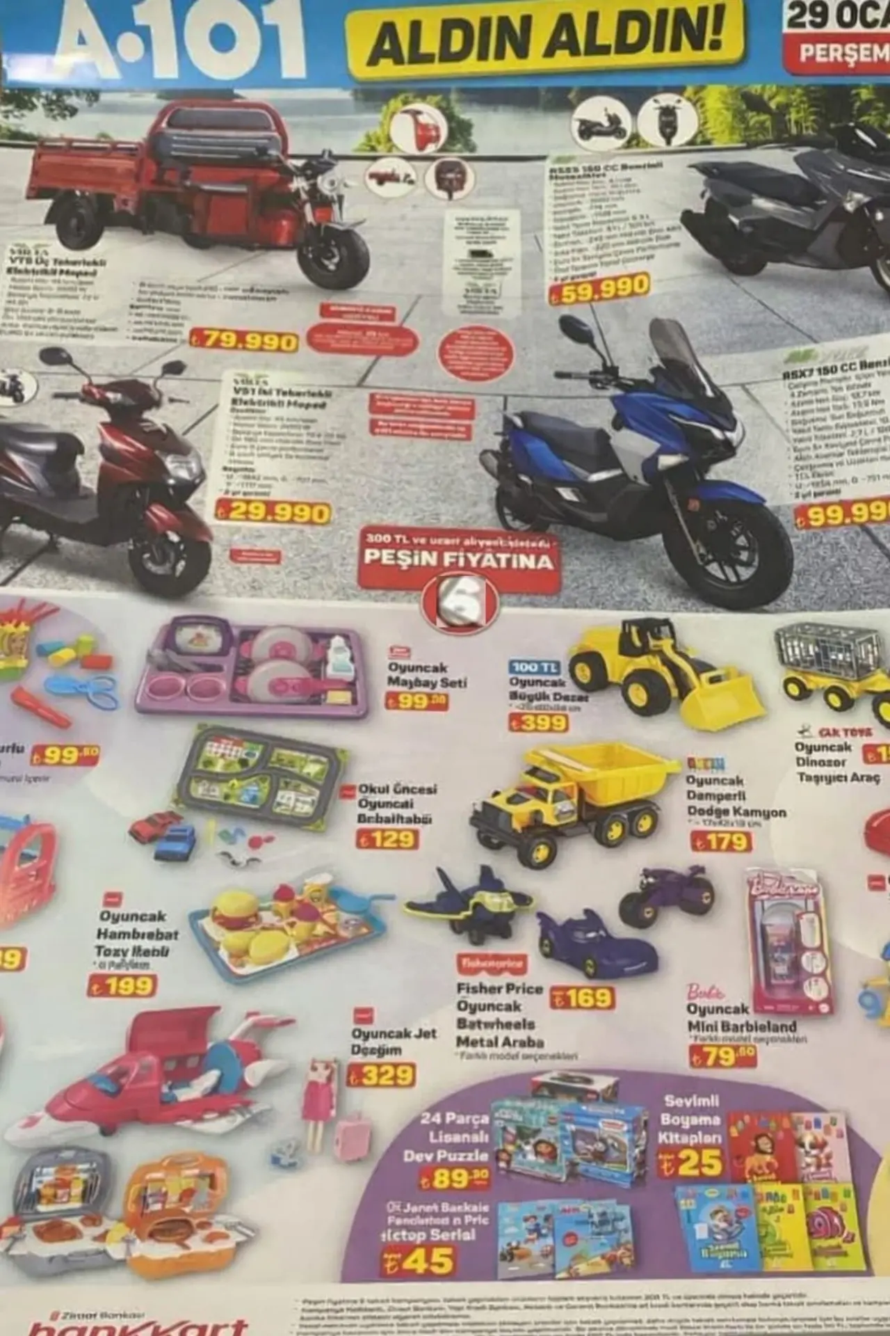 A101 Aktüel 29 Ocak 2026 Perşembe tarihli yeni kampanya kataloğunun diğer sayfalarında bir çok kategoride özenle seçilmiş olan çeşit çeşit indirimli aktüel ürünleri ile bu haftada ilgi odağı olacaktır. A101 Market farkıyla 29 Ocak A101 Kataloğu Elektrikli Ev Aletleri grubunda yer alan fırsatları A101 Online sitesinde, A101 Kapıda, A101 Hadi Veresiye seçeneği ve kredi kartına 3 taksit ile alabileceksiniz. A101 Aktüel 29 Ocak 2026 Kataloğu içeriğinde yer almış bu aktüel ürünleri ise; Singer Dikiş Makinesi 4,599 TL. English Home Multi Blender Seti 1,999 TL. Kiwi Elektrikli Cezve 499 TL. Vestel Saç Düzleştirici İyonik Tarak 699 TL. Arzum Cyclone Süpürge 3,999 TL. Arzum Mistost Tost Makinesi 1.999 TL. A101 29 Ocak 2026 sayfalarında bu hafta indirim listesine en fazla ilgi görecek Benzinli Motosiklet ve Elektrikli Bisikletler grubunda yine harika fırsatlar var; Volta EV1 Elektrikli Araç 229.990 TL. Volta VM6 Elektrikli Moped 59.990 TL. Aktüel Ürünler 29 Ocak 2026 Kataloğu ile bu haftada bir çok ürün kampanya listesinde ki yerlerini almış durumda. Büyük indirimlerle satışa sunulaca olan; Oscar Bonel Yaylı Tek Kişilik Yatak 2,500 TL. Nest Torba Yaylı Çift Kişilik Yatak 5,999 TL. Pierre Cardin Erkek Bakım Seti 899 TL. Pierre Cardin Epilatör 599 TL. Aprilla Şarjlı Saç – Sakal Kesme Makinesi 329 TL. Pierre Cardin Akıllı Vücut Analiz Baskülü 599 TL. A101 Katalog bu hafta kampanya detaylarını merakla beklediğiniz 29 Ocak 2026 A101 Kataloğu listesinde dikkatlerden kaçmayacak ürünler var; İşte büyük ilgi görecek olan; Volta VB1 Neo Katlanabilir Elektrikli Bisiklet 19,990 TL. Volta VB3 Elektrikli Bisiklet 19,990 TL. Alüminyum 27,5 Jant Bisiklet 6,690 TL. OLA EFL2 Electro Light Katlanabilir Elektrikli Bisiklet 17,990 TL. 29 Ocak 2026 A101 Kataloğu Züccaciye ve Mutfak grubunda yer almış fırsat ürünlerinde bu hafta; Hascevher Kumsal 6 Parça Tencere Seti 1,199 TL. Papilla Midi Tava Ürünleri 189 TL. Papilla Ocak Üstü Döküm Tost Makinesi 599 TL. English Home Patisserie Kek Kalıbı Çeşitleri 449 TL. Ayaklı Cam Sunumluk 149 TL. Paşabahçe Invatation Oval Tabak 3’lü 150 TL. Kristal Kahvaltılık Set 179 TL. 2’si 1 Arada Kapaklı Termos Bardak 399 TL. Borosilikat Çay Bardağı 6’lı 169 TL. Çay Bardağı Taşıma Kabı 89,50 TL. Çift Cidarlı Borosilikat Kupa 129 TL. Borosilikat Demlik 249 TL. Saklama Kabı Seti 3’lü 199 TL. Yapışmaz Buzluk 34,50 TL. Salata Kurutucu 199 TL. Sevimli Pipet 4’lü 59,50 TL. Su Şişesi 49,50 TL. Plastik Ürünler 59,50 TL. Metal Çırpıcı 59,50 TL. daha fazlası 5 Şubat 2026 tarihine kadar geçerli olacak fırsat ürünleri A101 Market indirim reyonlarında A101 Online sitesi A101 Kapıda seçeneği ile 29 Ocak 2026 Perşembe gününden itibaren sizleri bekliyor.