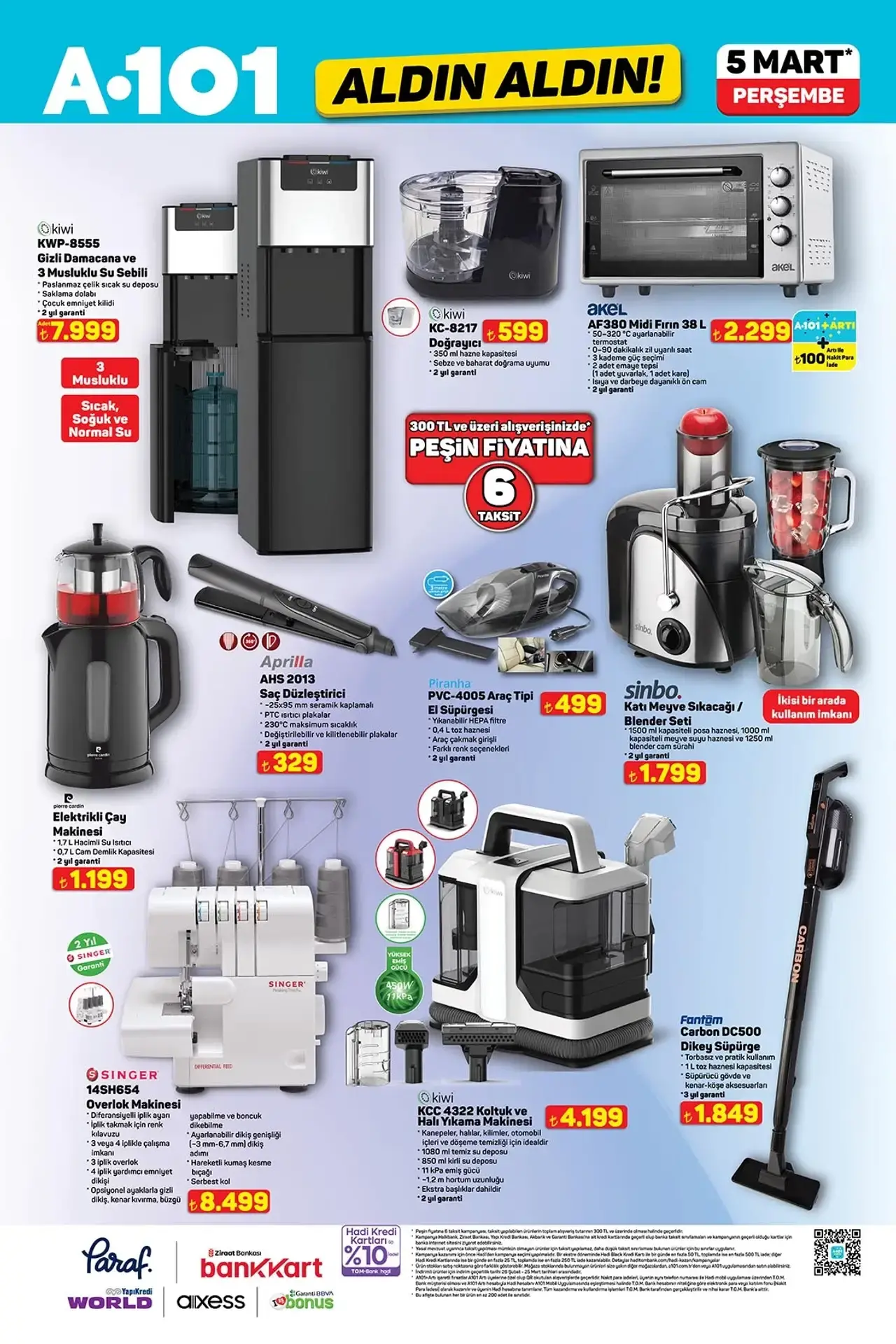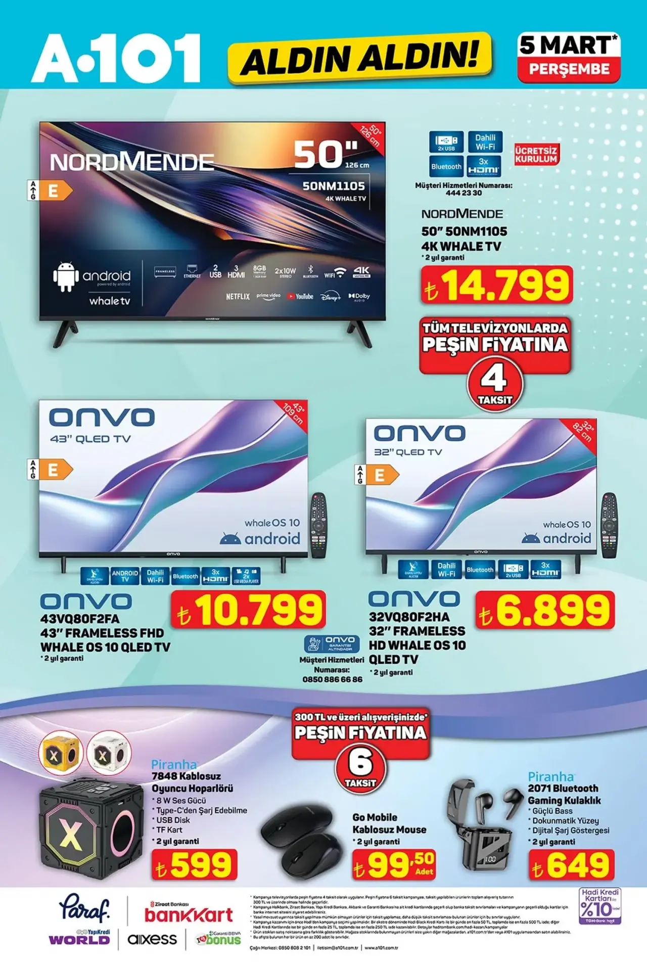 5 Mart 2026 perşembe itibarıyla başlayıp hafta boyu raflarda stoklar dahilinde bulunması kesinleşen A101 indirimlerinde vitrinde elektronik ürünler ve televizyonlar var. Evde yapılabilecek en kolay eğlenme yollarından olan TV izlemeyi daha keyifli hale getirecek olan büyük ekran televizyonlar ve çevre birimleri bu hafta geliyor.Nordmende ve Onvo Marka Televizyonlar 50 inç, 43 inç ve 32 inç seçenekleriyle farklı bütçelere farklı ekran boyutlarıyla hitap eden akıllı televizyonlar sunuyor. 14799 TL, 10799 TL ve 6899 TL fiyatlara sahip bu tv’ler ekran ve panel kaliteleriyle de dikkat çekiyor. Sayfada ayrıca Piranha Kablosuz oyuncu hoparlörü, Bluetooth kulaklık ve kablosuz mouse gibi uygun fiyatlı teknolojik aksesuarlar da bulunuyor. Özellikle Piranha 7848 kablosuz oyuncu hoparlöründe 599 TL fiyat ve şık tasarım dikkatlerden kaçmıyor. Diğer bir A101 5 Mart 2026 katalog sayfasında pratik ev aletlerinde bu hafta çeşitlilik oldukça fazla. Singer Overlok Makinesi: Evde dikiş yapanlar için haftanın en dikkat çeken ürünlerinden biri. 8499 TL fiyatıyla da fırsat olduğunu ortaya koyuyor. Ayrıca diğer ürünlerde Fantom dikey süpürge 1849 TL’den ve Kiwi koltuk/halı yıkama makinesi 4199 tl’den temizlik işlerini kolaylaştırmak için geliyor. Mutfak elektroniğinde de indirim var: Akel midi fırın 2299 TL, Kiwi su sebili 7999 TL, Sinbo katı meyve sıkacağı 1799 TL ve çay makinesi 1199 TL olarak mutfakların vazgeçilmezi olmaya aday.