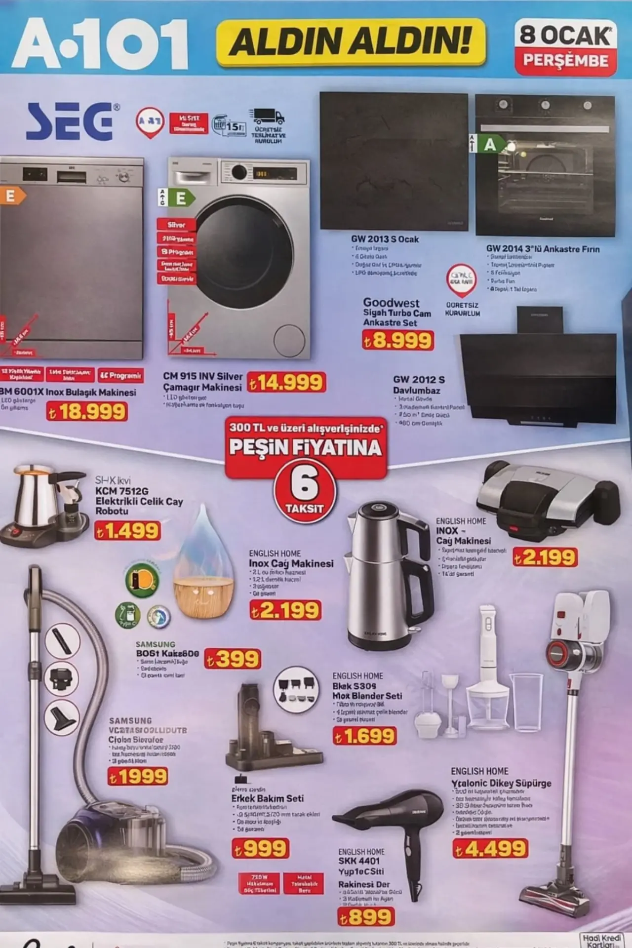 8 Ocak 2026 A101 Kataloğu sayfalarında dikkatleriçeken indirimli aktüel ürünleri ile yeni yıla muhteşem bir kampanya ile devam eden A101 Market 8 Ocak 2026 Kataloğu bu haftada çok konuşulacak. Türkiyenin en büyük market ağına sahip olan A101 Market her kampanya döneminde olduğu gibi bu haftada enflasyonla mücadele kapsamında uygulamış olduğu indirimlerini yeni kampanyası ile devam ettiriyor. A101 Aldın Aldın kampanya etiketi ile 8 Ocak 2026 Perşembe gününden itibaren A101 Market şubelerinde, A101 Onlıne sitesi, A101 Kapıda seçenekleri ile satışa sunulacak A101 8 Ocak 2026 Kataloğu ile haftanın aktüel ürünler ilk sırasında bu haftada Teknoloji grubunda fırsatları dikkatleri çekiyor. Peşin fiyatına 3 taksit imkanı ile; PHILIPS markası ile 2 yıl garantili ücretsiz kurulum avantajlı Dolby Atoms smart özellikli sihirli kumanda, dahili wifi ve 4K Ultra Hd uydu alıcılı Youtube ve Netflix gibi prime video hazır uygulamaları ile Phılıps 65″ 4K UHD Led Dolby Atoms Smart TV 29,999 TL. Phılıps 50″ 4K UHD Led Dolby Atoms Smart TV 17,999 TL. bu aktüel ürünleri A101 kampanya avantajı ile kredi kartına taksit imkanı ile alabilirsiniz. A101 yeni dönem kampanya detayları merakla beklediğiniz 08 Ocak 2026 A101 Aktüel kataloğu içinde ki Teknoloji ürünleri bu kadarla sınırılı değil tabi ki; TOSHIBA markası ile 2 yıl Vestel Servis garantili Vıdaa işletim sisitemli Toshıba 50″ 4K UHD Vıdaa TV 14,999 TL. ONVO markası ile 2 yıl garantili Google işletim sistemi, Qled teknolojisi ile göz dolduran dahili uydu alıcılı dahili uydu alıcılı, kablosuz görüntü aktarma ve smart özellikleri ile Onvo 55″ Frameless UHD Qled Goole TV 16,999 TL. bu ürünleri peşin fiyatına 3 taksit imkanı ile alabileceksiniz. A101’de bu hafta kampanya listesinde Beyaz Eşya grubunda 8 Ocak 2026 A101 Aktüel Katalog içeriğinde yer almış fırsat ürünleri ise; SEG markası ile 2 yıl garantili olan 10 iş gününde Ücretsiz teslimat ve kurulum peşin fiyatına kredi kartına 3 taksit imkanı ile Led göstergeli, çocuk kilidi, 6 program, hızlı yıkama, 12 kişilik yıkama kapasiteli SEG Bulaşık Makinesi 10,499 TL. Çift kapılı 451 litre iç hacime sahip olan SEG No-Frost Buzdolabı 19,999 TL. REGAL markası ile 2 yıl garantili Büro Tipi Buzdolabı 6,999 TL. indirimli fiyatları A101 Kataloğu kampanya avantajları ile bu ürünleride kredi kartına peşin fiyatına 3 taksit ile 15 Ocak 2026 Perşembe gününe kadar alabilirsiniz.