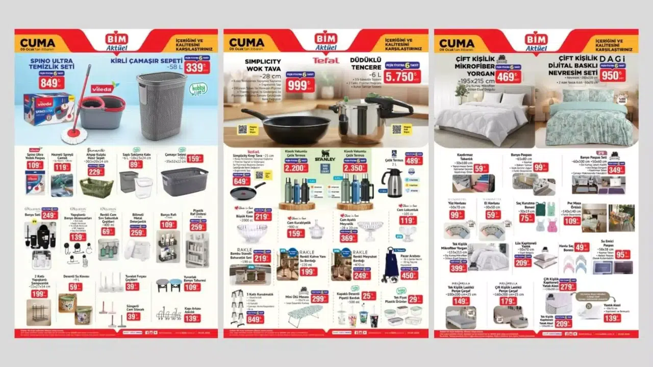BİM marketin 9 Ocak 2026 kataloğu, geniş ekranlı televizyonlar ve Kumtel ankastre setler gibi teknolojik ürünlerin yanı sıra kış mevsimine uygun ısıtıcılar ve termal kıyafetlerle dolu zengin bir içerik sunuyor. Mutfakta Stanley termos ve Tefal ürünleri öne çıkarken, kırtasiye malzemelerinden ev tekstiline kadar uzanan geniş ürün yelpazesiyle her bütçeye uygun pratik çözümler BİM marketlerde yerini alıyor.