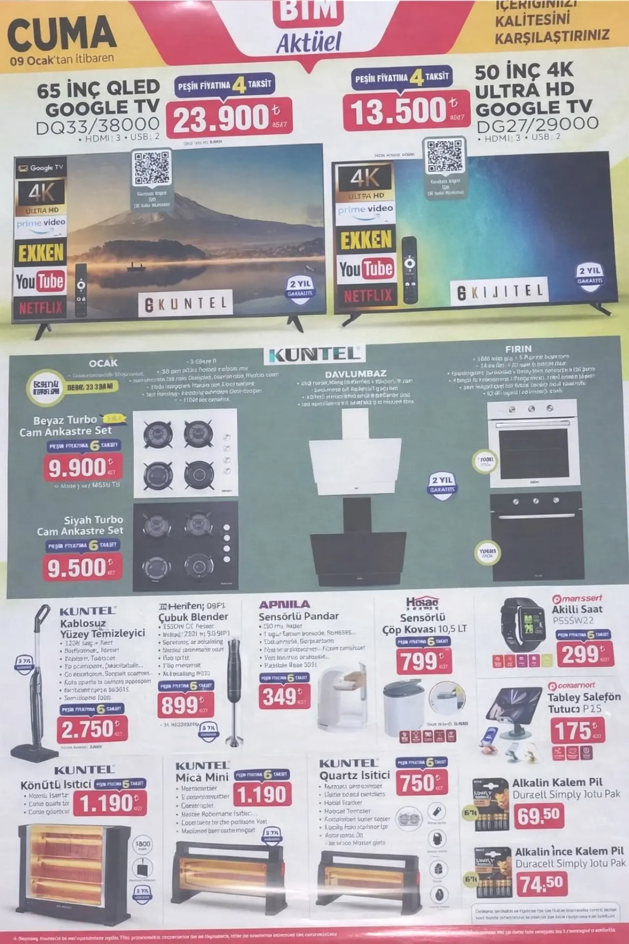 TCL 65 İnç 4K HDR Google TV 26,900 TL. TCL markası ile Android işletim sistemli TCL 43 İnç Full HD Android TV 11,250 TL. lik fiyatı ile bu haftanın teknoloji kategorisinde ilk sıradaki aktüel ürünü diyebiliriz. Bim Aktüel Kataloğu ile 9 Ocak 2026 Cuma Kampanya listesinde yer almış ilk sayfasında ki teknoloji grbunda aktüel ürünleri bu kadarla sınırlı değil tabi ki; OMIX marksı ile 2 yıl garanti, 6 GB ram ve 128 GB dahili hafızalı, güçlü kameralar ve dahili TWS Kulaklık ile Omıx X5 Cep Telefonu ve TWS Kulaklık 5,990 TL. Bluetooth Kulak Üstü Kulaklık 1,490 TL. bu muhteşem ürünleri yine Bim market kampanya farkıyla alabilirsiniz. Bim 9 Ocak 2026 Kataloğu ilk sayfasında büyük ilgi görecek diğer ürünler ise; POLOSMART markası ile Kablolu Çocuk Kulaklığı 349 TL.