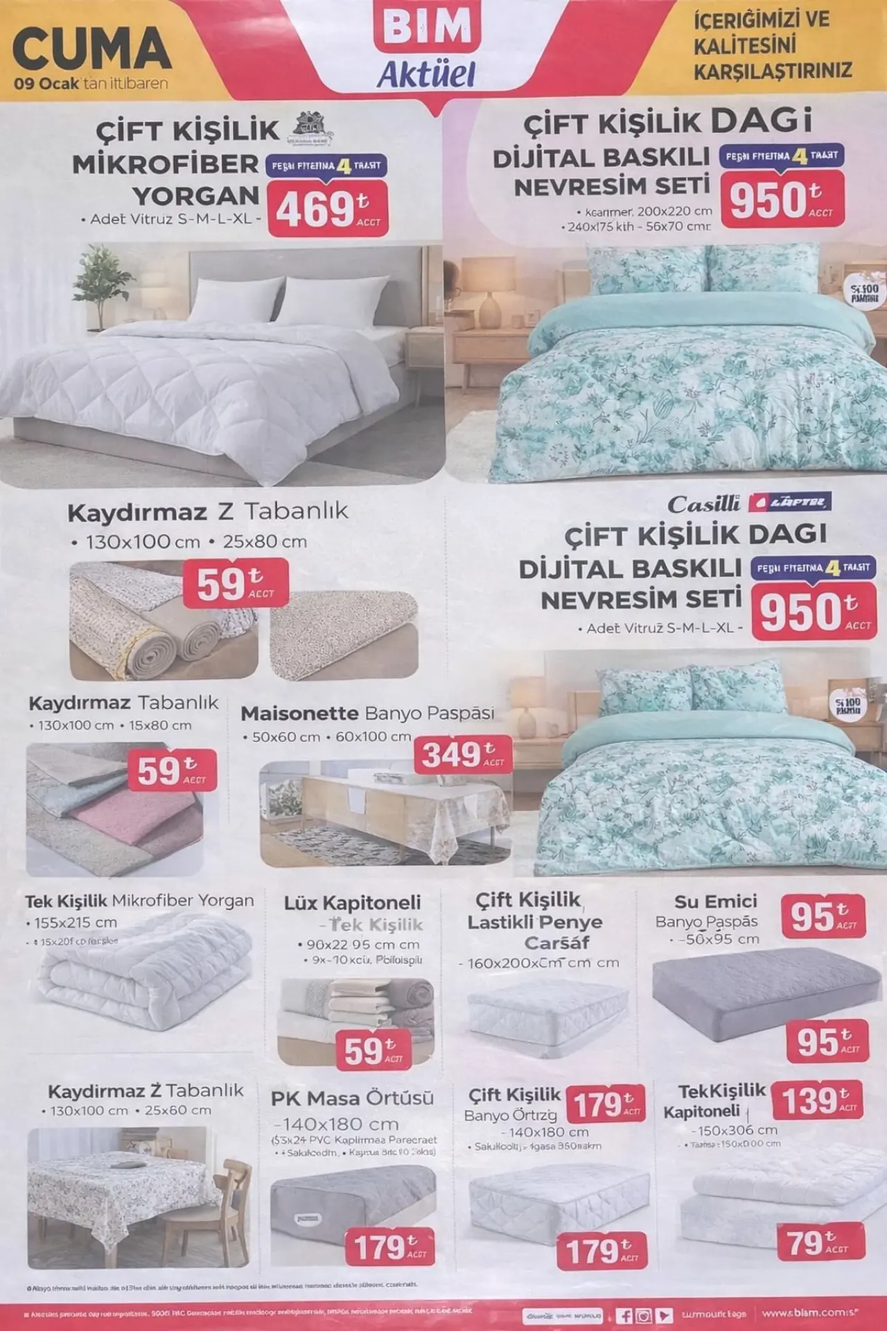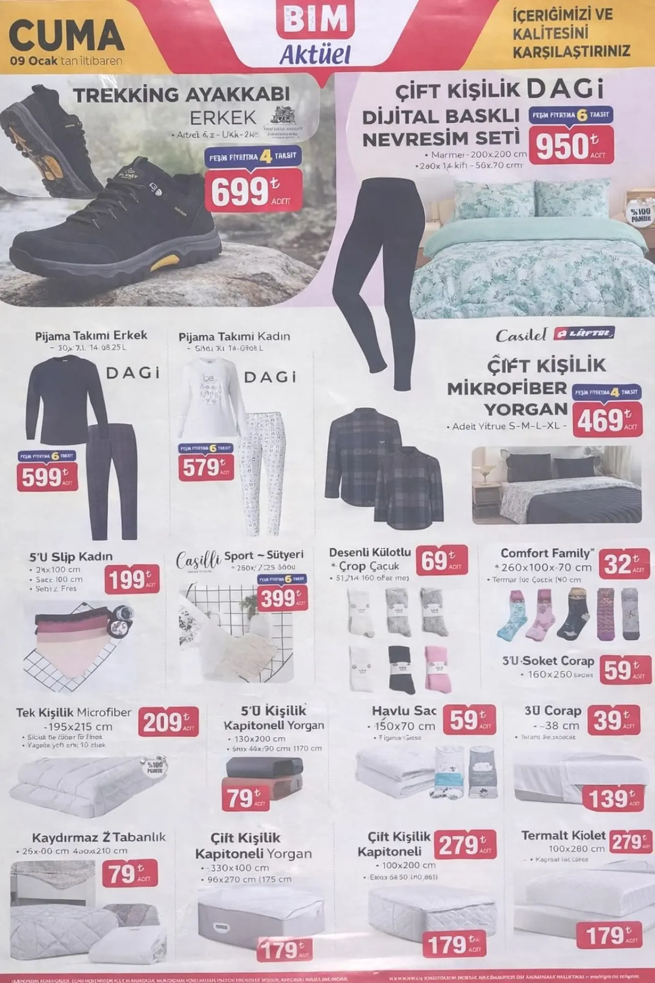 Polosmart Mini Tıraş Makinesi 349 TL. Polosmart Yüz ve Boyun Bakım Cihazı 499 TL. WAG Maşası 790 TL. Bim 9 Ocak 2026 kataloğu kampanyası içerisinde bu hafta büyük ilgi göstereceğiniz Ev Eşyaları kategorisinde aktüel ürünleri var. İşte; İmex 4K 30FPS Aksiyon Kamerası 1,790 TL. Natura Love ledli Organizer Makyaj Aynası 349 TL. Figürlü Aydınlatma Askılı Tavşan 399 TL. Casilda Home Ütü Masası 799 TL. Casilda Home Kelebek Kurutmalık 649 TL. BİM de gelecek hafta kataloğu olan 9 Ocak 2026 Cuma kampanyaları Giyim kategorisinde ki haftanın aktüel ürünleri; Kapitoneli Çift Kişilik Yatak Örtüsü 389 TL. Kadın Eşofman Altı 299 TL. Kapitoneli Tek Kişilik Yatak Örtüsü 329 TL. Kadın Omuz Çantası 329 TL. Bim’de Bu Hafta 9 Ocak 2026 kampanya listesinde büyük ilgi göreceğini düşündüğümüz Züccaciye aktüel ürünleri arasında; Chef’s Sütlük 189 TL. Chef’s Karnıyarık Tenceresi 439 TL. Chef’s Krep Tava 229 TL. Rendeli Saklama Kabı 199 TL. Chef’s Tava 289 TL. 9 Ocak Bim Kataloğu 2026 kampayalarında en fazla merak edilen Züccaciye ve Mutfak kategorisi aktüel ürünleri bu haftada dikkatleri fazlasıyla çekiyor. İşte; Çelik Sefer Tası 309 TL. Tek Fiyat Mutfak Ürünleri 22 TL. Temizlik Seti 199 TL. Yapışkanlı Duvar Karosu 289 TL. lik fiyatları ile Bim Aktüel Kataloğu yeni dönem kampanyalı ürünleri olarak Bim Kampanya avantajları ile kredi karına peşin fiyatına taksit imkanı ile 9 Ocak 2026 Cuma gününden itibaren Bim Market mağazaları indirim reyonlarında sizleri bekliyor.