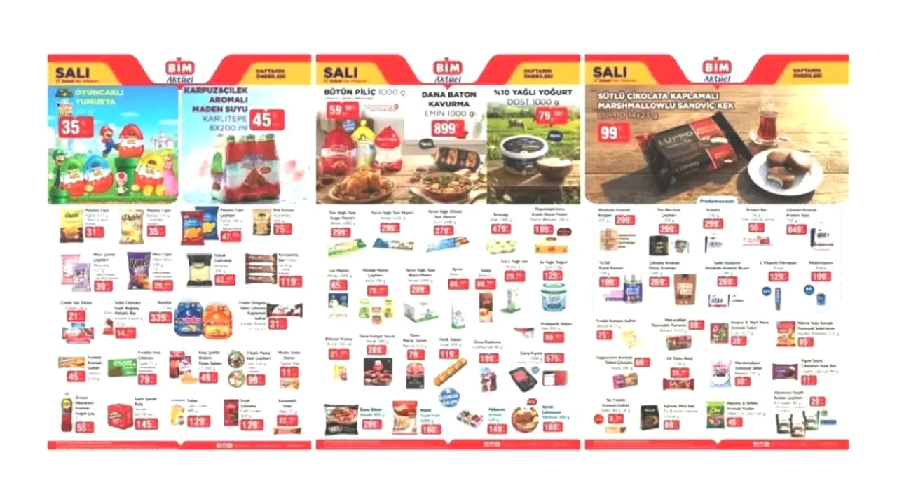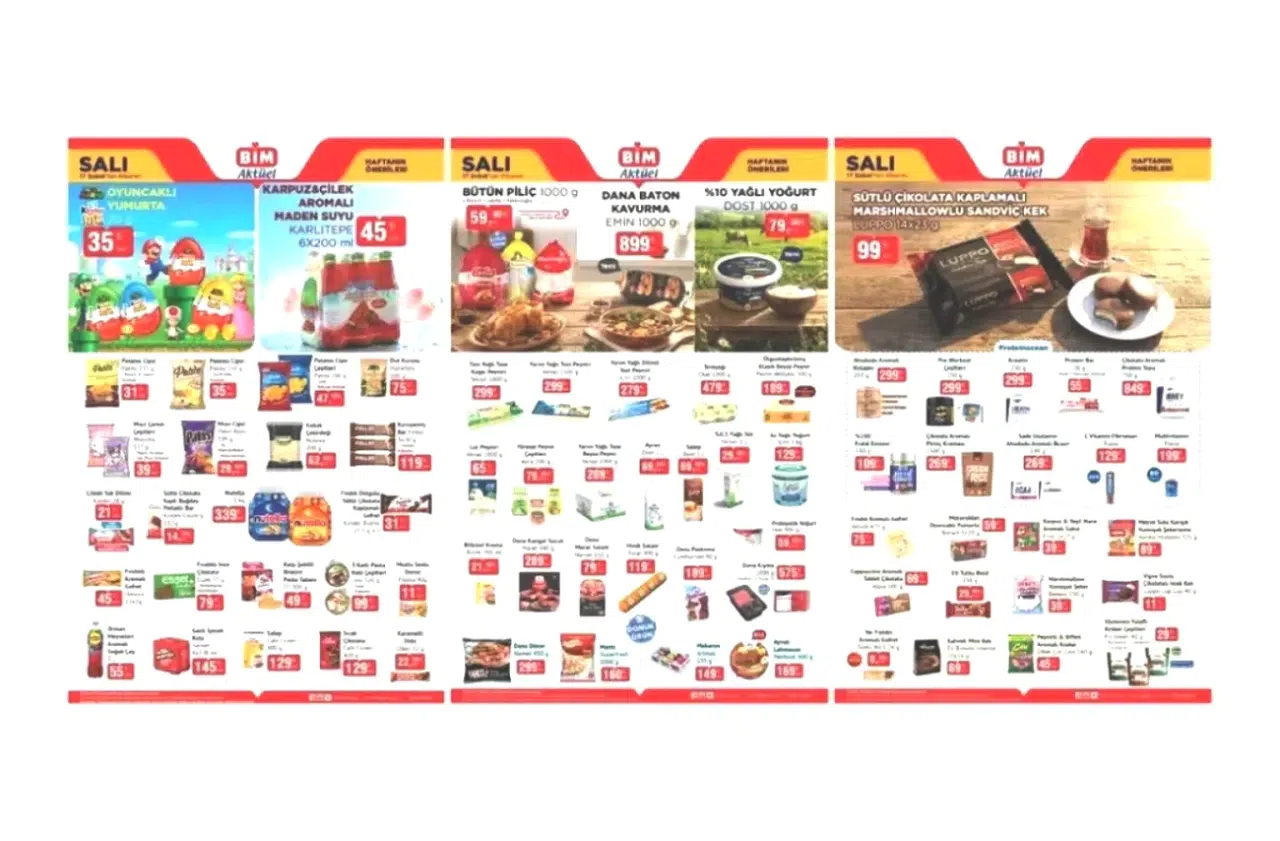 BİM'de bu hafta, Proteinocean markasına ait kolajen, kreatin ve protein tozu gibi besin takviyeleri dikkat çekiyor. Ayrıca, Nutella'nın 1 kg ağırlığında olan büyük kavanozu da raflarda yerini aldı. Et ve süt ürünleri kategorisinde ise, Emin marka dana baton kavurma, Dost'un %10 yağlı yoğurdu ve Teksüt kaşar peyniri gibi temel gıda ürünleri ön plana çıkıyor. Atıştırmalık seçenekleri olarak, Kinder, Patito ve Luppo markalarının popüler ürünleri tüketicilere sunuluyor. Pratik öğün arayanlar için ise, Namet marka dana döner ile Superfresh'in mantı çeşitleri uygun fiyatlarla satışa sunuluyor.