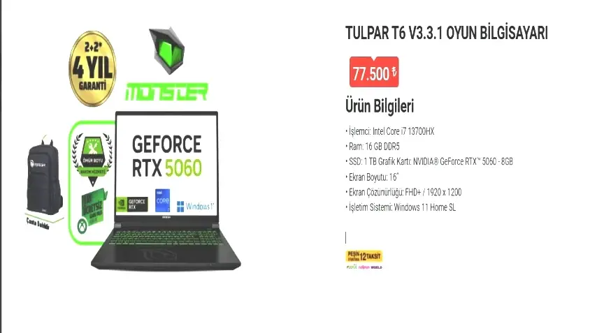Normal şartlar altında 85 bin 999 TL fiyat etiketiyle satışa sunulan Monster Tulpar T6 V3.3.1 model oyun bilgisayarı, BİM’e özel özel bir fiyatla 77 bin 500 TL’ye alıcılarla buluşacak. Bu kampanya sayesinde tüketiciler, toplamda 8 bin 499 TL tasarruf etme fırsatına sahip olacak.