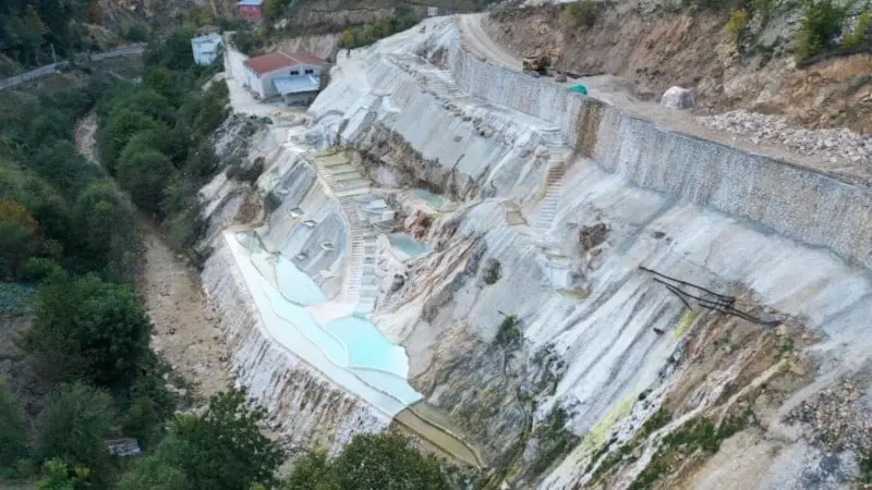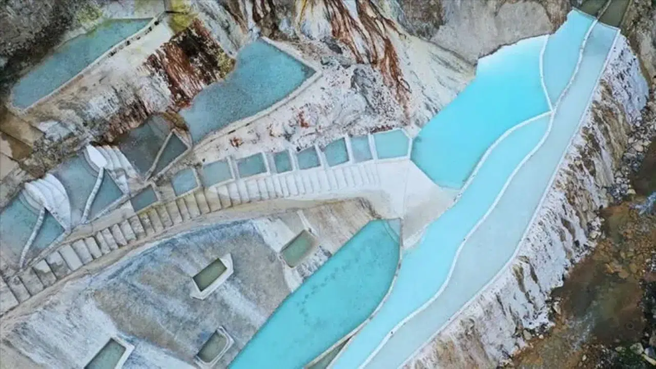 Göletlerin arasında ise ziyaretçiler için yürüyüş yolları yapıldı. Mineralli suların aktığı alandaki yürüyüş yolları bir süre sonra beyaz rengi alırken, göller ise turkuaza büründü.