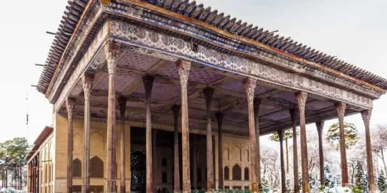 Bahçesi ve yansıma havuzuyla ünlü Çehel Sütun Sarayı, Safavi döneminin estetik anlayışını yansıtır. İç mekândaki freskler tarihî sahneleri anlatır. Huzurlu bir gezinti sunar.