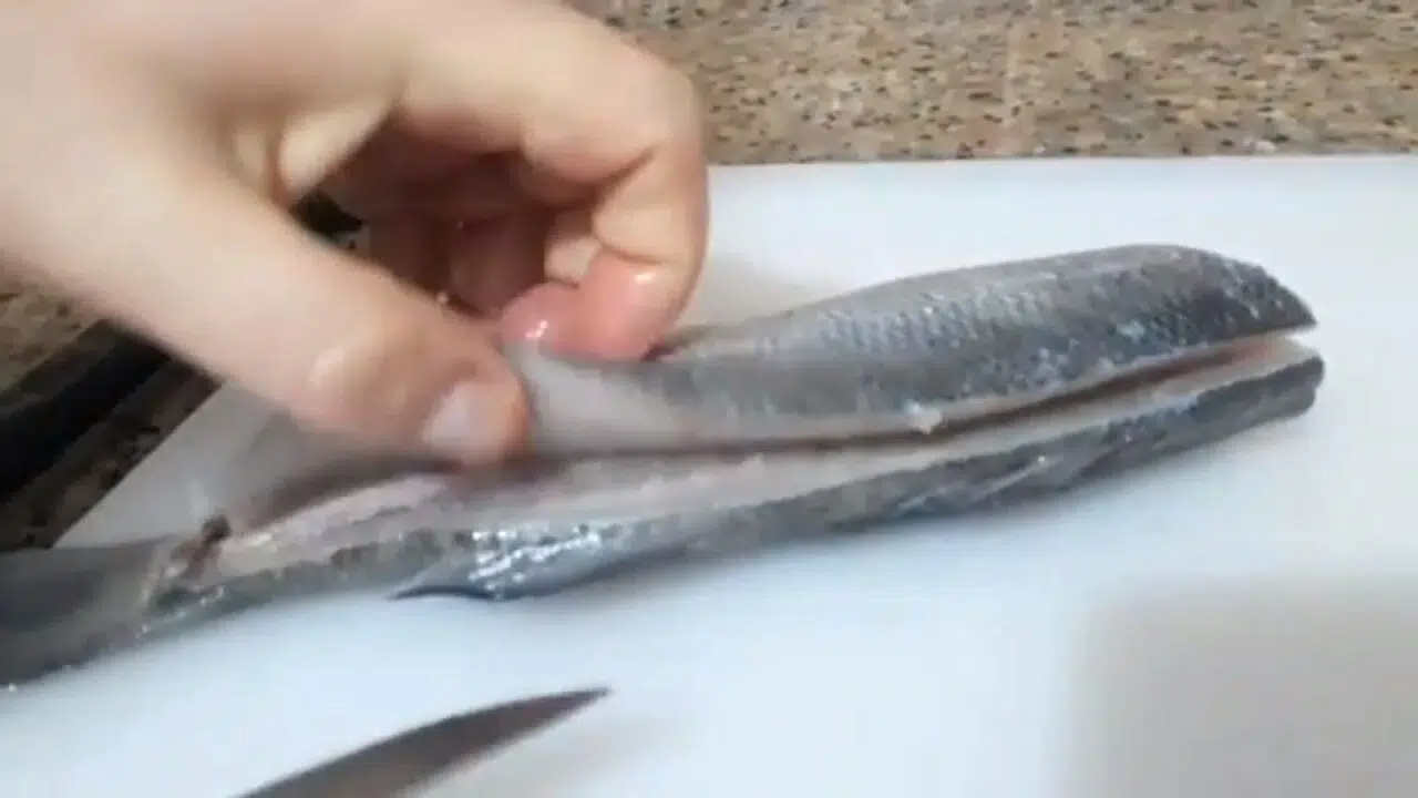 İki fileto elde ettiniz. Deriyi ayırmak için: Filetoyu tahtaya koyun, kuyruk ucundan bıçak sokup deriyi nazikçe çekerek kesin. Kemik kalanlarını penseyle çıkarın.
