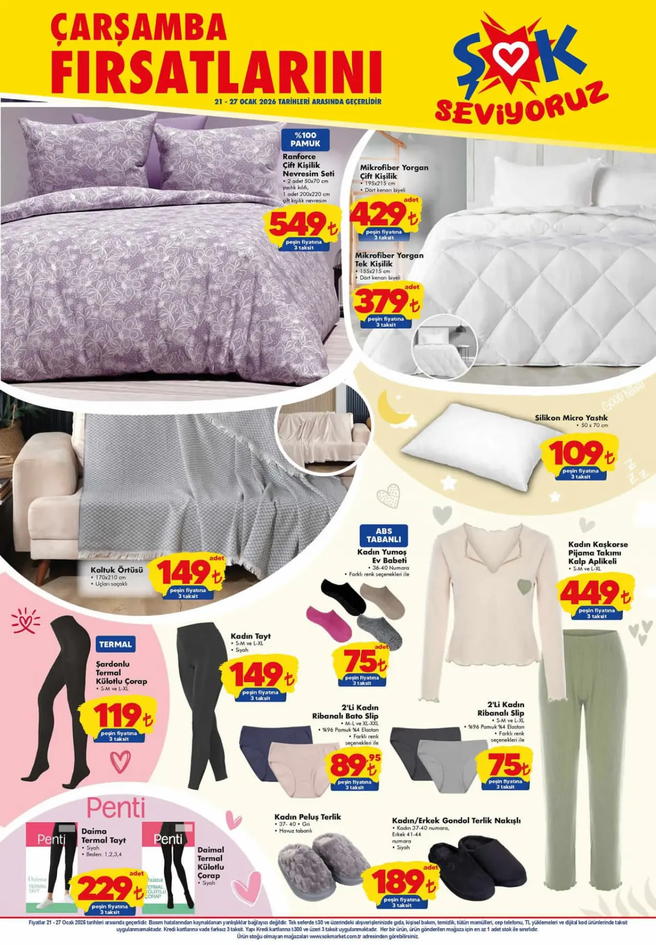 Temel ihtiyaç grubunda haftanın aktüel ürünleri 21 Ocak Çarşamba gününden itibaren Şok Aktüel Kataloğu kapsamında reyonlarda yerlerini alacaklar. İşte; Dinarsu marka kalitesi ile Pelüş Halı 120×180 cm 549 TL. Pelüş Halı 80×125 cm 349 TL. Minderli Puf Oturak Dışarı Kapaklı Ayakkabılık 749 TL. Kaymaz Rulo Halı Örtüsü 100 TL Adet. Katlanabilir Banyo Paspası 199 TL. İkili Askı 25 TL. Gül Desenli Havlu 25 TL. Yeni dönem Aktüel Ürünler olarak 21 Ocak 2026 Çarşamba günü geçerli kampanya listesinde en fazla ilgiyi görecek fırsat ürünleri ise;Kopça-Vantuzlu Kapı Altı Stoperi 699 TL. Masa Örtüsü Tutucu 699 TL. Kaydırmaz Rulo Halı Tutucu 3995 TL. Venüslü Banyo Paspası 75 TL. Çok Amaçlı Sıpa Matı 25 TL. Kapı Arkası Askılık 3995 TL. Bornuz Askısı Ne Alırsan 50 TL 50 TL. Kare Havluluk Ne Alırsan 50 TL 50 TL. Çember Havluluk Ne Alırsan 50 TL. Kağıt Havluluk Ne Alırsan 50 TL. Şok 21 Ocak 2026 Kataloğu içeriğinde ki aktüel ürünleri devamında; Çift Kişilik Penye Lastikli Çarşaf 199 TL. Tek Kişilik Penye Lastikli Çarşaf 179 TL. Tek Kişilik Welsoft Battaniye 259 TL. Çift Kişilik Pamuklu Battaniye 279 TL. Kadın Leopar Biyeli Pijama Takımı Aplike 349 TL. Kadın Kadife Pijama Takımı Leopar Desenli 349 TL. Kadın Pelüş Terlik 189 TL. Pelüş Saç ve Maske Bandı Seti 3’lü 8995 TL. Kadın Pelüş Alt Giyim Leopar Biyeli 149 TL. Kadın Pelüş Ponponlu Taban Terlik 249 TL. Kadın Desenli Kemer 6995 TL. Kadın Tekli Soket Çorap 6995 TL. 2’li Kadın Soket Çorap 3995 TL. Kadife Paspas Çeşitleri Hoş Geldiniz 7995 TL. Ocak döneminin ilk indirim kampanyası olan 21 Ocak 2026 Şok Aktüel Kataloğu detaylarında;Karmen 3’lü Saklama Kabı 119 TL. Paslanmaz Çelik Termos 449 TL. Mehtap Kapaklı Balık-Börek Tava 499 TL. Kapaklı Lav Leopar Kahve Yanı Su Bardağı 50 TL. Deri Kulplu Metal Tepsi 169 TL. Cambu Kedili Kupa 5995 TL. Yuvarlak Tepsi 100 TL. Renkli Dikdörtgen Saklama Kabı 3’lü Set 199 TL. Akasya Kapaklı Kesme Tahtalı Ekmeklik 399 TL. Akcam Salata Kasesi 149 TL. Çelik Sütlük 199 TL.