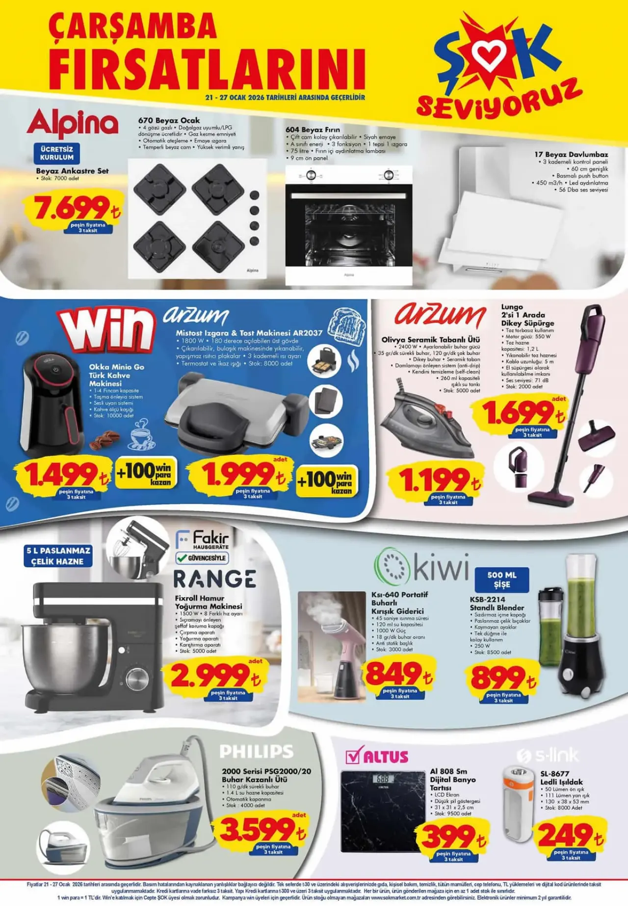 İşte; 28 Ocak 2026 Çarşamba tarihine kadar Şok Marketin indirim reyonlarında yerlerini alacak olan Şok 21 Ocak 2026 Kataloğu kampanyalı fırsat ürünlerinin yer aldığı ilk sayfasında;