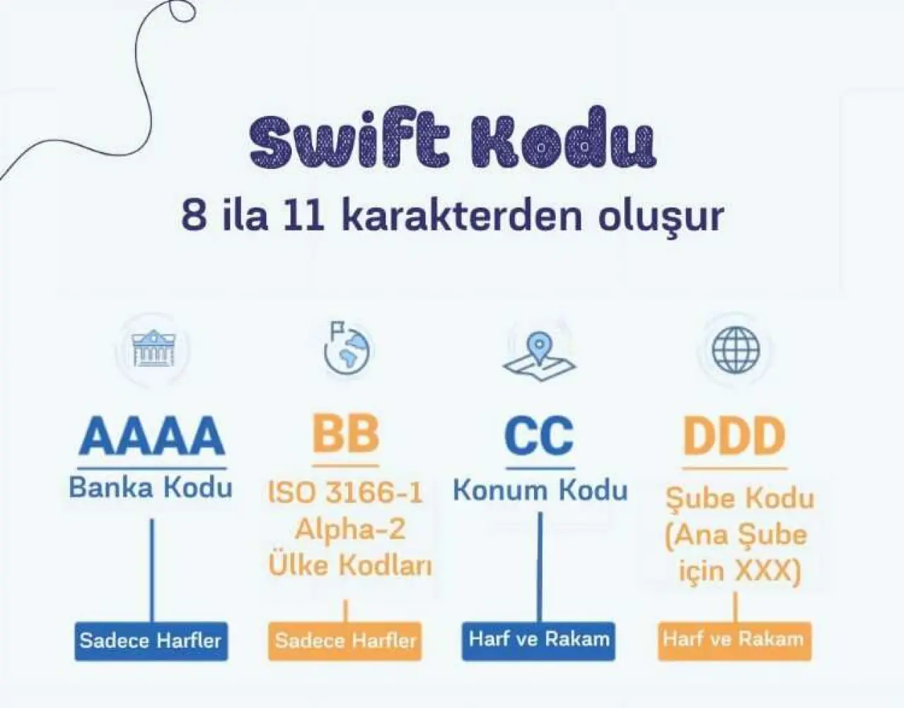 Banka kodu (4 harf): SWİFT kodunun ilk dört harfi bankayı temsil eder ve genellikle banka adının kısaltılmış hali gibi görünür.