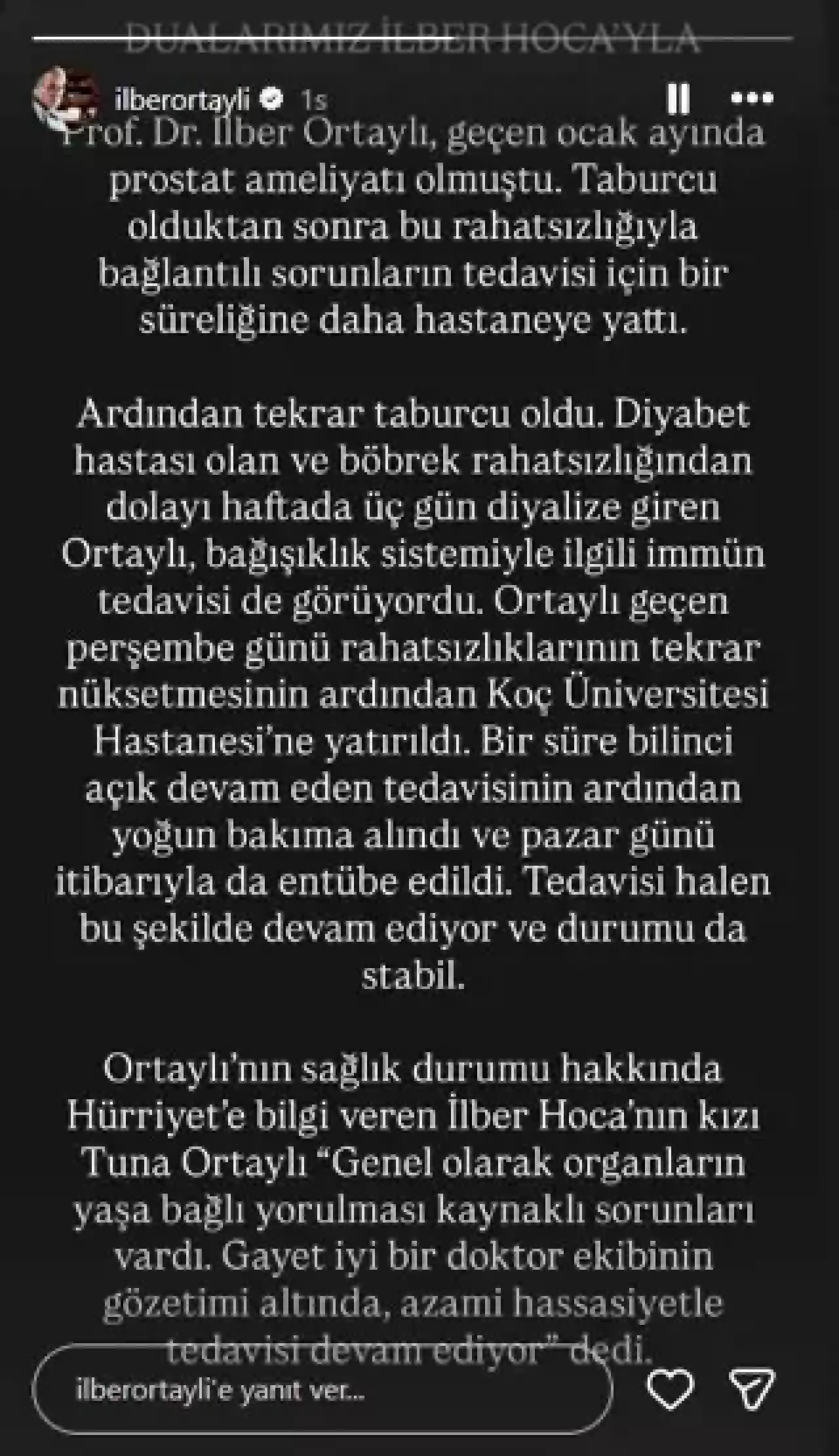 Açıklamada "İlber Ortaylı'nın beş gündür yoğun bakımda tedavisi devam etmektedir. Durumu stabildir. Alanında çok iyi bir ekip tarafından büyük bir özenle takip edilmektedir. İyi dileklerinizin ve dualarınızın yardımcı olacağını umuyoruz." denilmişti.
