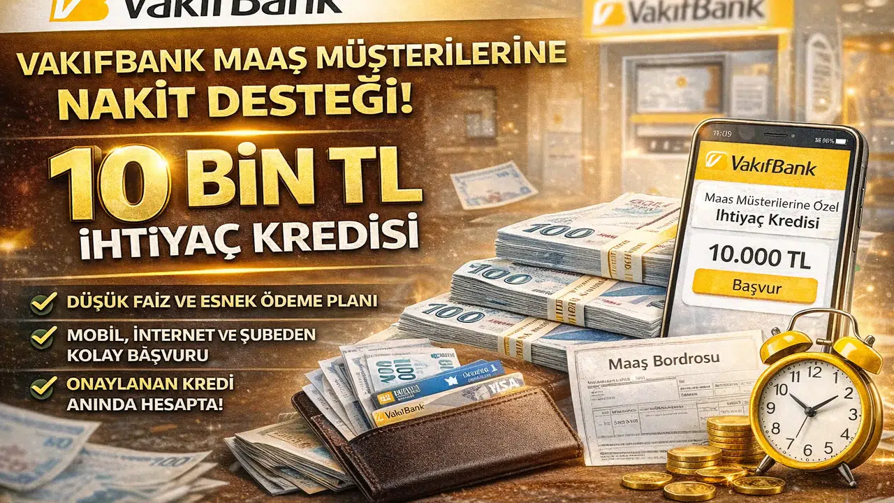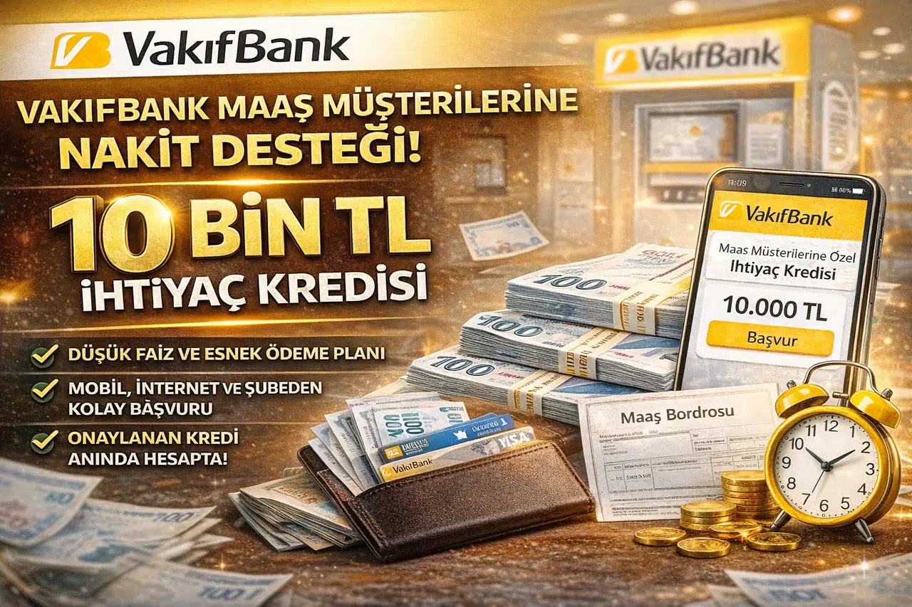 VakıfBank, maaşını bankadan alan müşterilerine yönelik yeni bir ihtiyaç kredisi kampanyasını hayata geçirdi. Banka tarafından duyurulan kampanya kapsamında, maaş müşterilerine özel 10 bin TL’ye kadar düşük faizli ihtiyaç kredisi imkânı sunuluyor. Hızlı başvuru ve aynı gün hesapta ödeme avantajı sunan kampanya, kısa vadeli nakit ihtiyacı olan vatandaşlara önemli bir destek sağlamayı hedefliyor.
