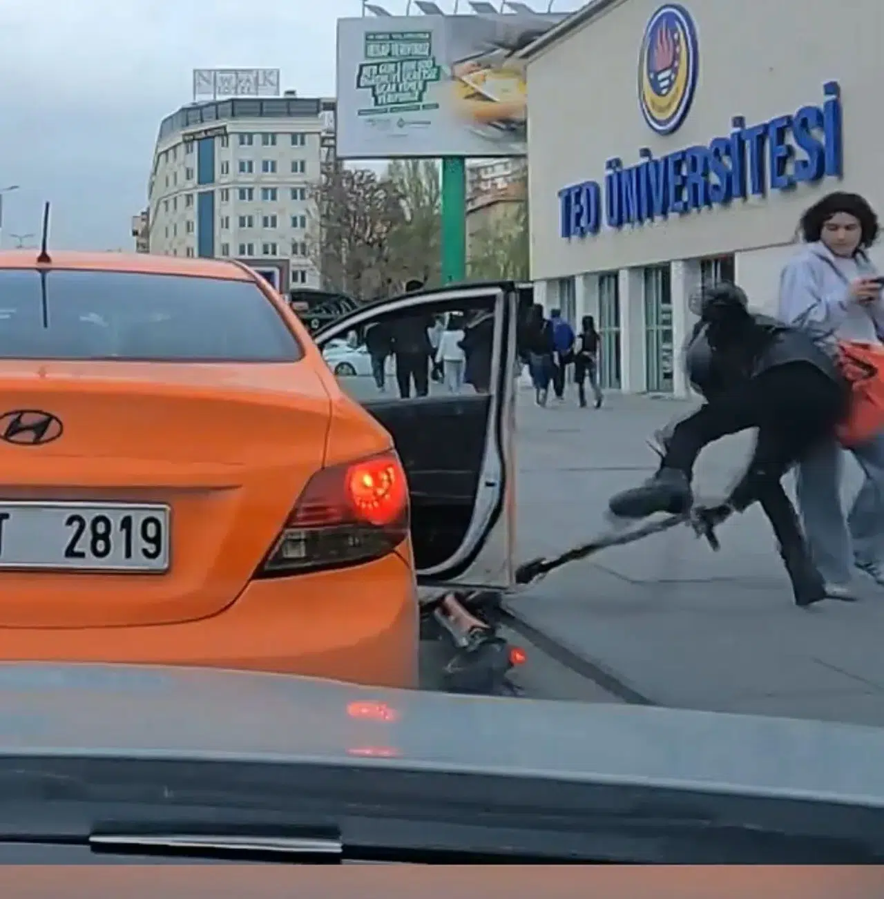 Taksinin sağından ilerlemeye çalışan scooter sürücüsü, ani bir şekilde açılan kapıya çarparak dengesini kaybetti ve kaldırıma savruldu.