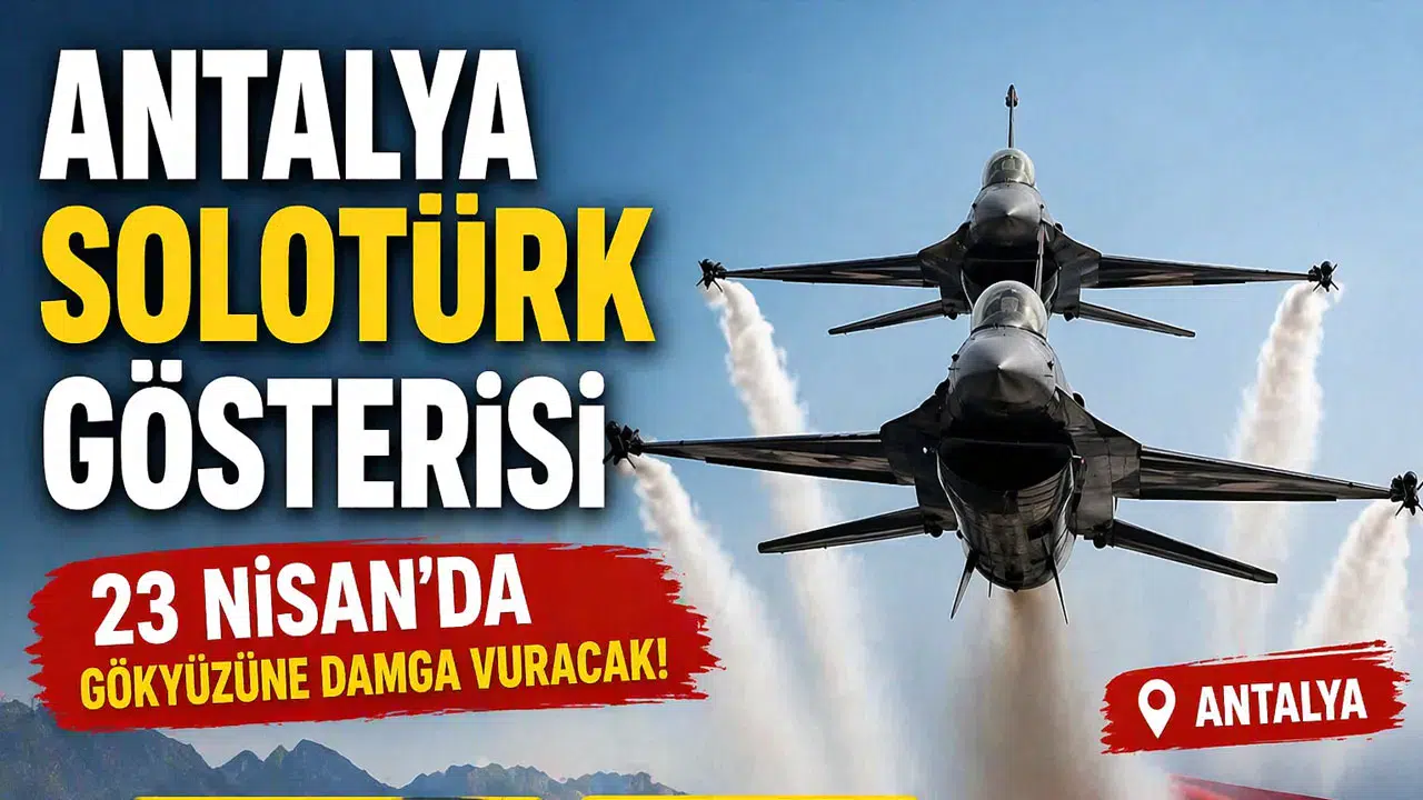 Antalya SOLOTÜRK 23 Nisan Ulusal Egemenlik ve Çocuk Bayramı gösterisi 23 Nisan Perşembe günü gerçekleştirilecek. Akrobasi gösteri ekibi çevre tanıma ve prova uçuşlarının ardından büyük gösteriyi yapacak. SOLOTÜRK Antalya gösterisi 23 Nisan 2026 Perşembe günü saat 17.00 olduğunda başlayacak.