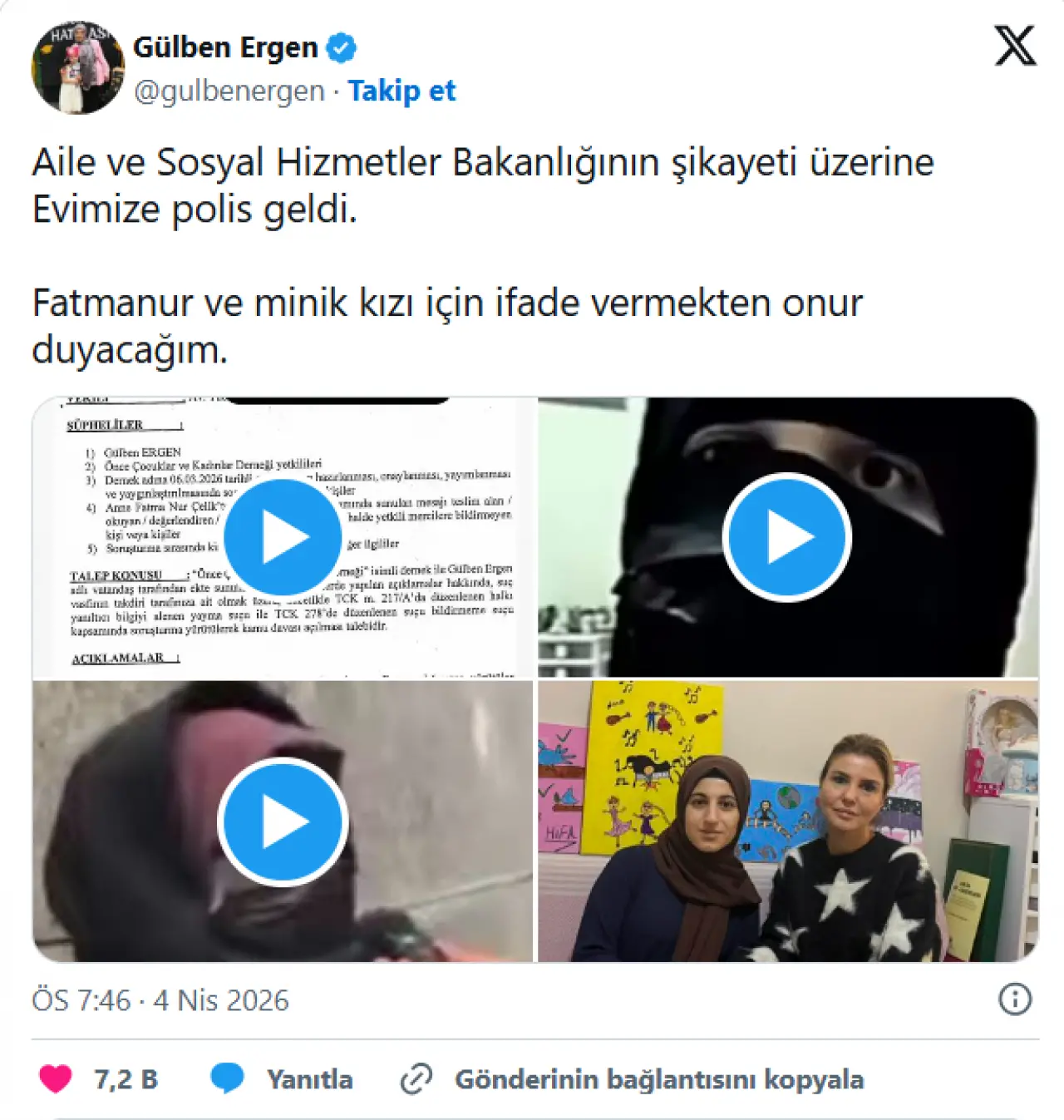 Sanatçı Gülben Ergen, Fatmanur Çelik ve kızı Hifa İkra Şengüler hakkında sosyal medya üzerinden yaptığı paylaşımlar nedeniyle soruşturma kapsamında ifade verecek. Konuya ilişkin açıklamayı kendi sosyal medya hesabından yapan Ergen, sürecin T.C. Aile ve Sosyal Hizmetler Bakanlığı’ın şikâyeti üzerine başlatıldığını belirtti.