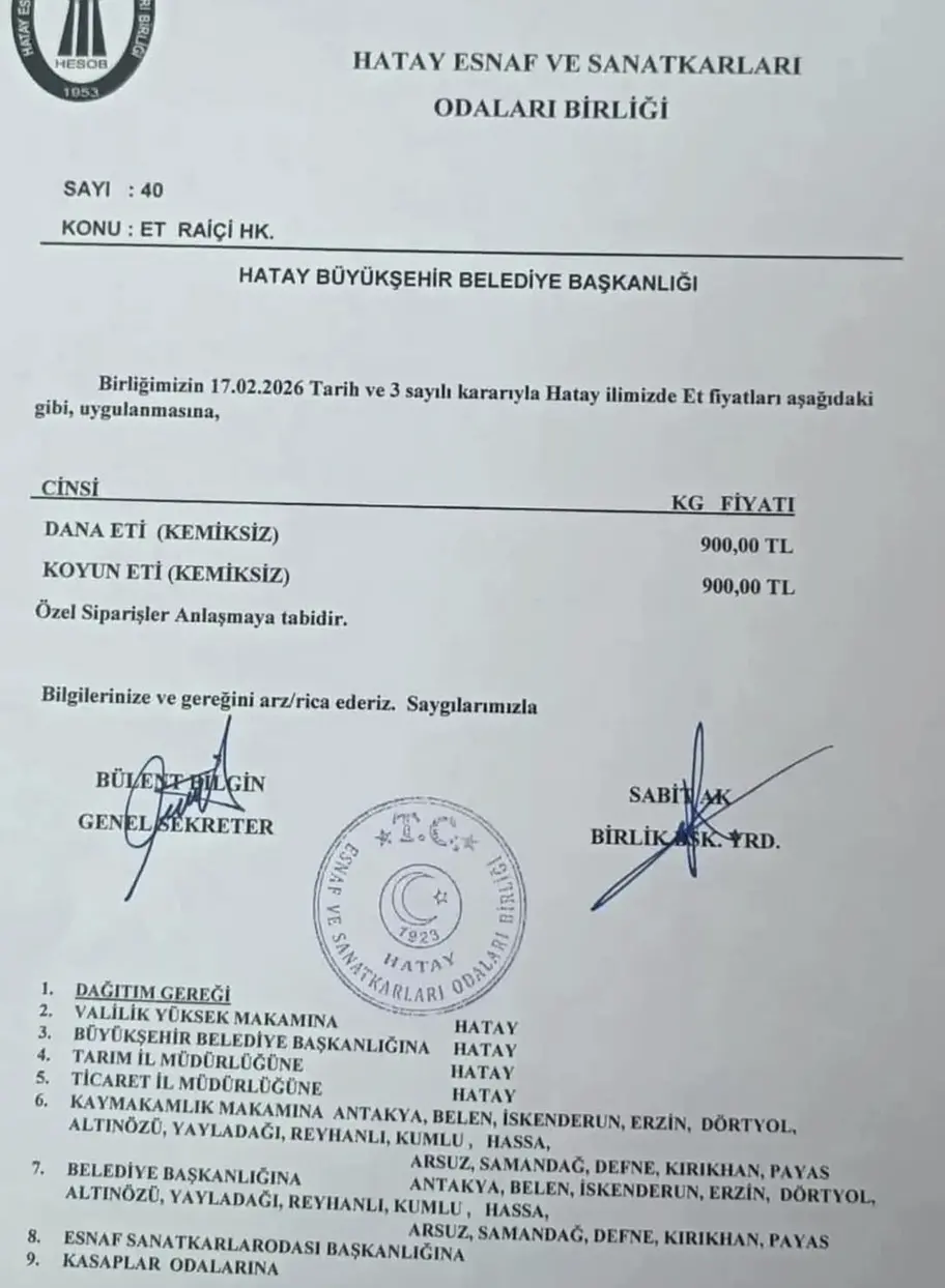 Hatay Esnaf ve Sanatkarları Odaları Birliği’nin 17 Şubat 2026 tarihli ve 3 sayılı kararı doğrultusunda, il genelinde et fiyatlarına zam yapıldı.