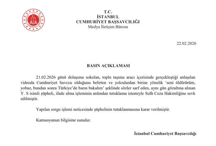 Başsavcılık tarafından yapılan açıklamaya göre, 21 Şubat 2026 tarihinde dolaşıma sokulan bir videoda, kendisini Cumhuriyet Savcısı olarak tanıtan Y.S. adlı şüpheli, bir yolcuya yönelik “Seni öldürürüm, yobaz, bundan sonra Türkiye’de barın bakalım” şeklinde tehditlerde bulundu.