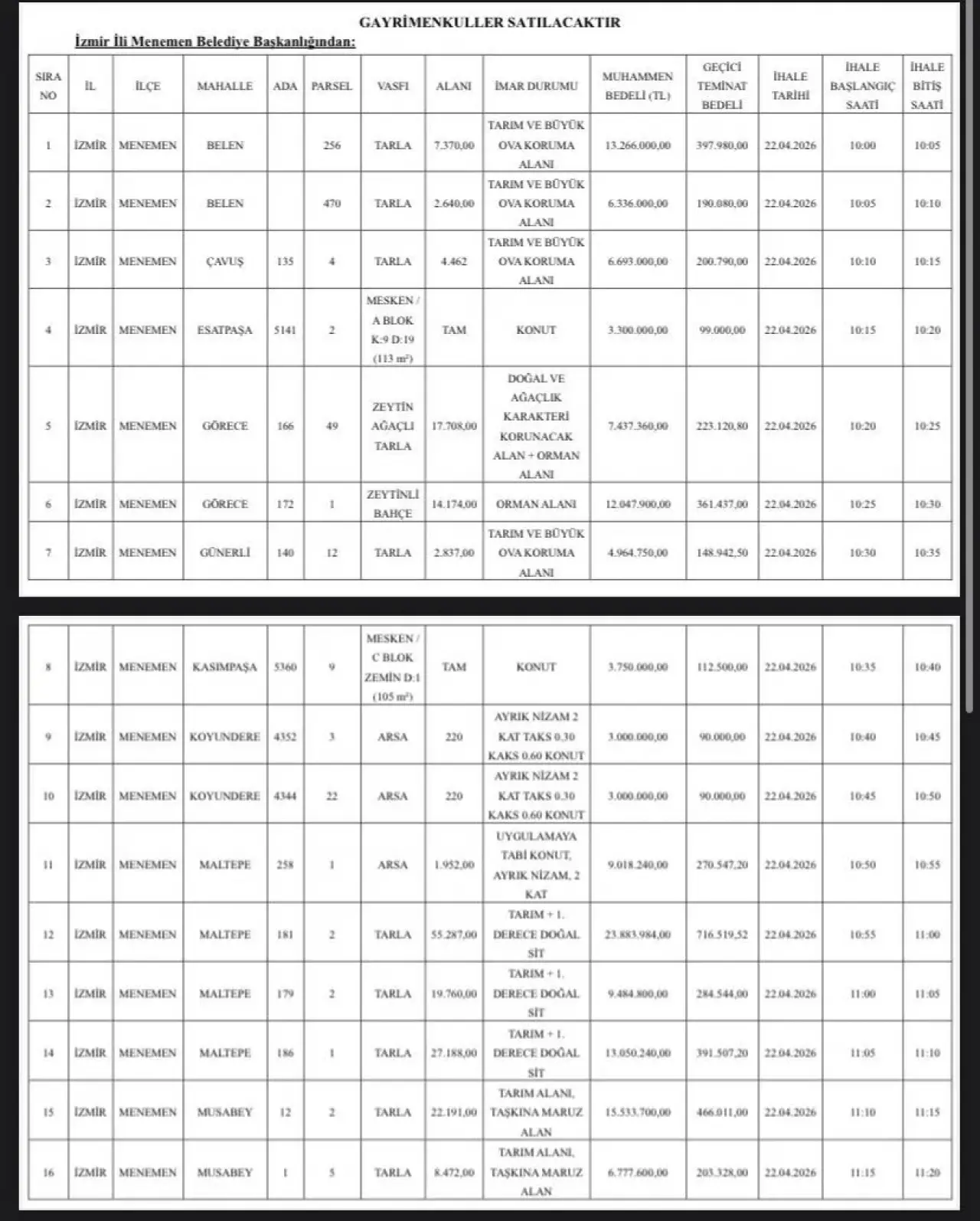İzmir’in ilçesi Menemen Belediyesi 35 taşınmazını satış için ihaleye çıkardı. 6 Nisan 2026 tarihli Resmî Gazete’de yayımlanan ilana göre satışlar, 22 Nisan 2026 tarihinde gerçekleştirilecek. Taşınmazlar arasında birçok ilçesinden tarla, zeytinlik, bağ, arsa ve konut niteliğindeki alanlar yer alıyor.
