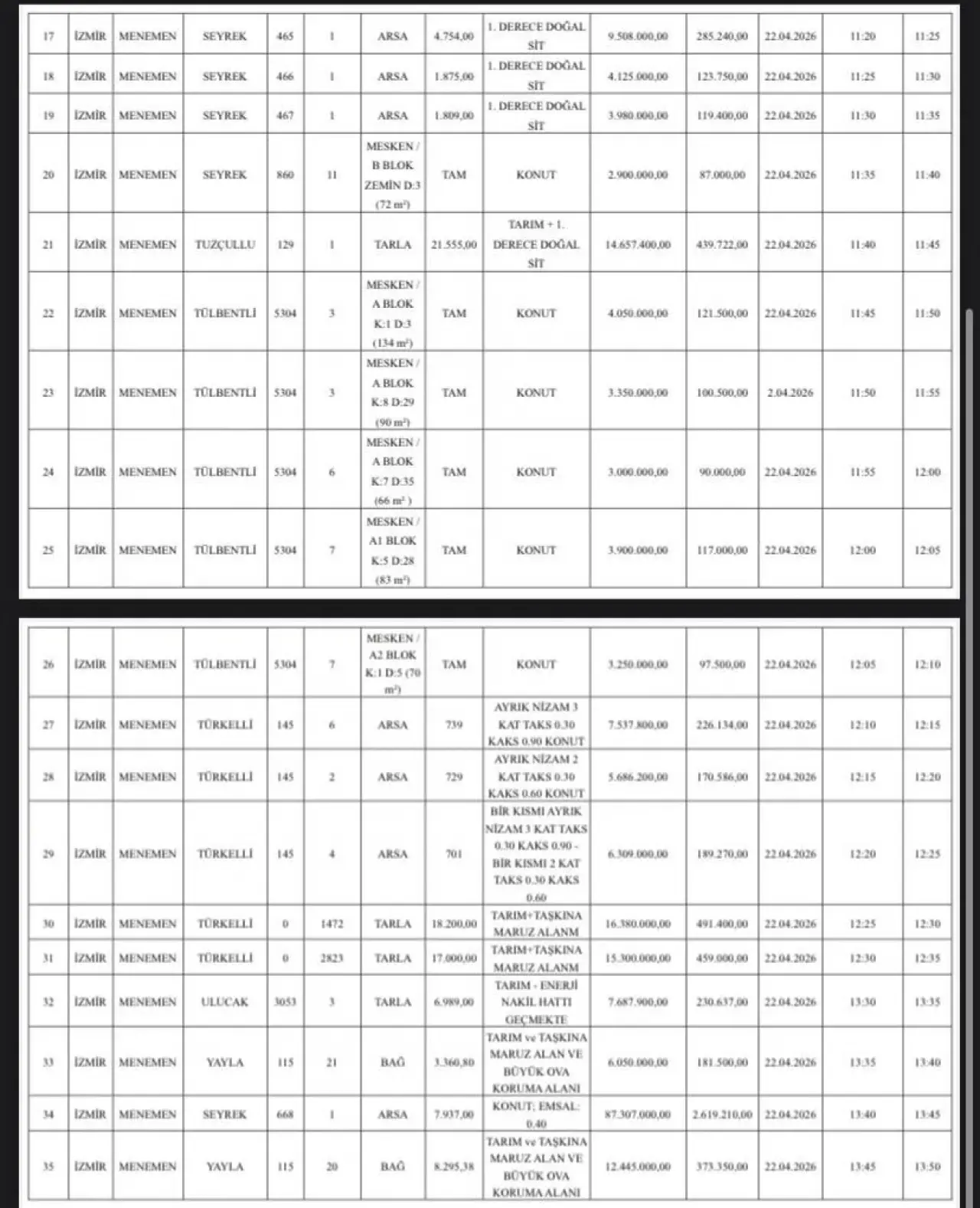 Taşınmazların listesi şu şekilde;