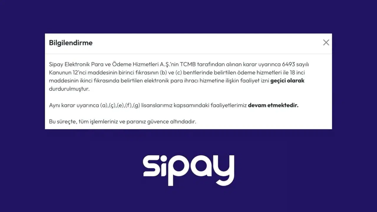TCMB, 28 Ekim 2025’te Sipay’in bazı faaliyetlerini geçici olarak durdurdu.