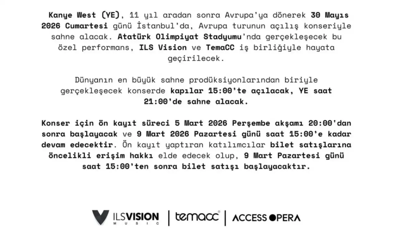 Kanye West’in İstanbul konseri 30 Mayıs 2026 Cumartesi günü düzenlenecek. Dev organizasyona İstanbul’un en büyük etkinlik alanlarından biri olan Atatürk Olimpiyat Stadyumu ev sahipliği yapacak.