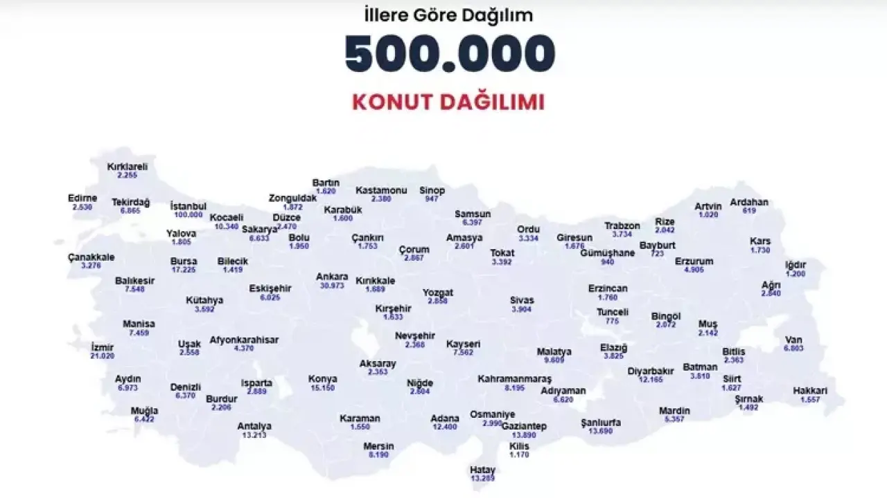 Projede en fazla konutun yapılacağı iller İstanbul, Ankara, İzmir, Bursa ve Konya olarak kayıtlara geçti. Bu doğrultuda 81 ilde 500 bin konutun yükseleceği ilçeler de netleşti.