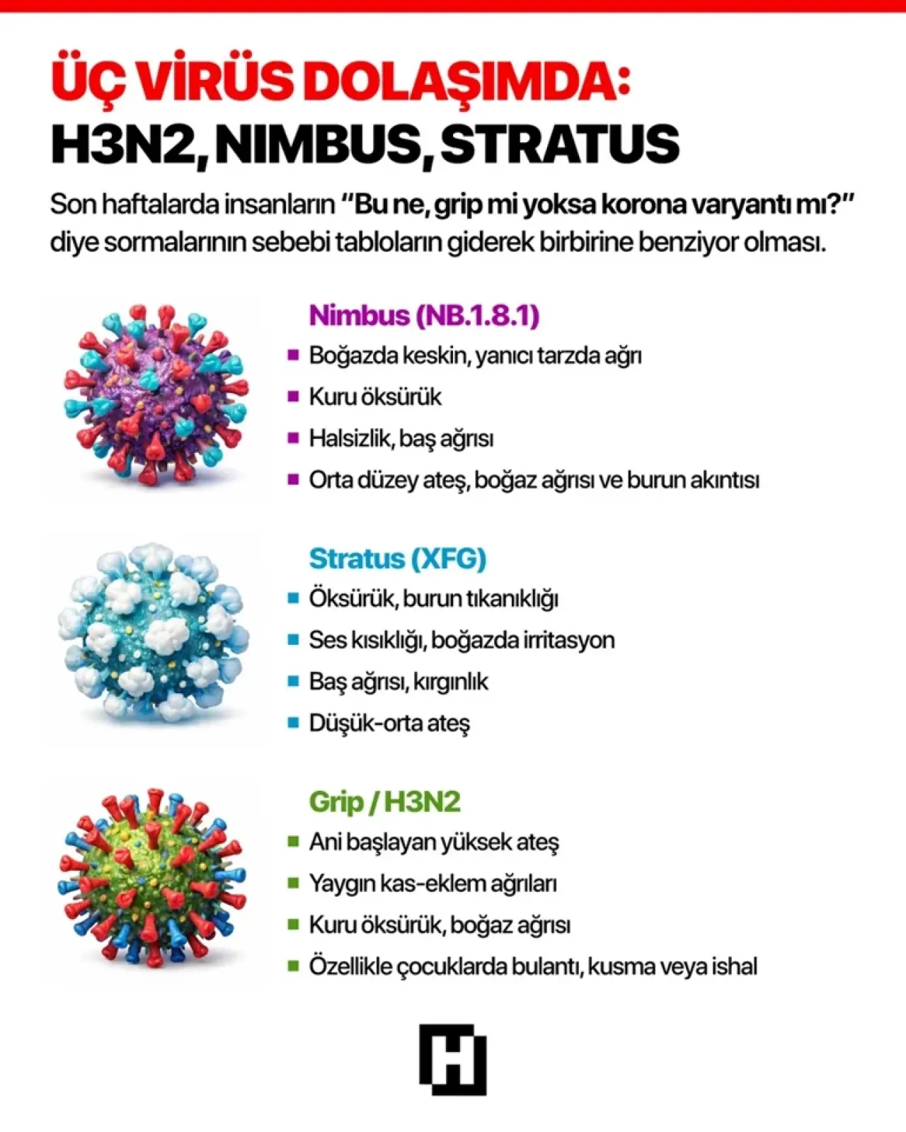 1- İkisini ayıran noktalar daha çok genetik soy ağacı, coğrafi dağılım ve semptom profiline dair küçük farklar. Nimbus (NB.1.8.1), LP.8.1 soyundan türemiş, ek mutasyonlar kazanmış bir alt çizgi. Stratus (XFG) ise iki farklı soyun rekombinasyonu sonucu ortaya çıkmış, 2025’te ‘izlem altında varyant’ olarak tanımlanmış bir alt varyant.