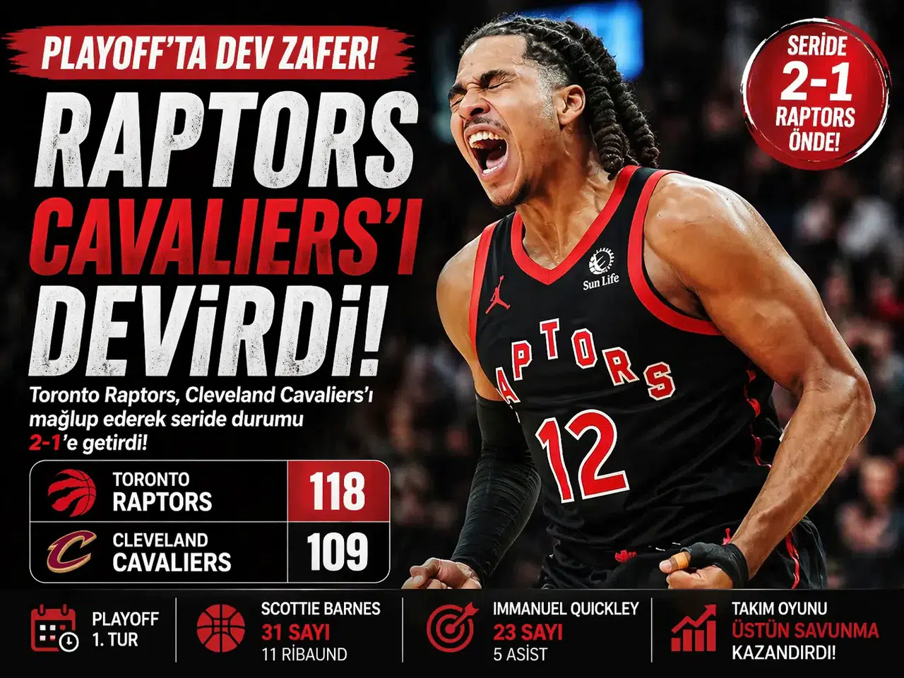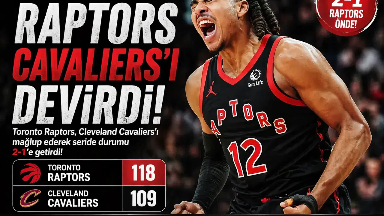 Amerikan Basketbol Ligi (NBA) play-off'ları ilk turunda Toronto Raptors, Cleveland Cavaliers'ı 126-104 mağlup ederek seride durumu 2-1'e getirdi. Scotiabank Arena'da oynanan maçta Scottie Barnes 33 sayı, 11 asistle, RJ Barrett da 33 sayıyla play-off kariyer rekorunu kırarken, Collin Murray-Boyles 22 sayı kaydetti. Raptors, Cavaliers'a karşı 12 maçlık play-off mağlubiyet serisine son verdi. Cavaliers'ta James Harden 18, Donovan Mitchell ve Max Strus, 15'er sayıyla oynadı.